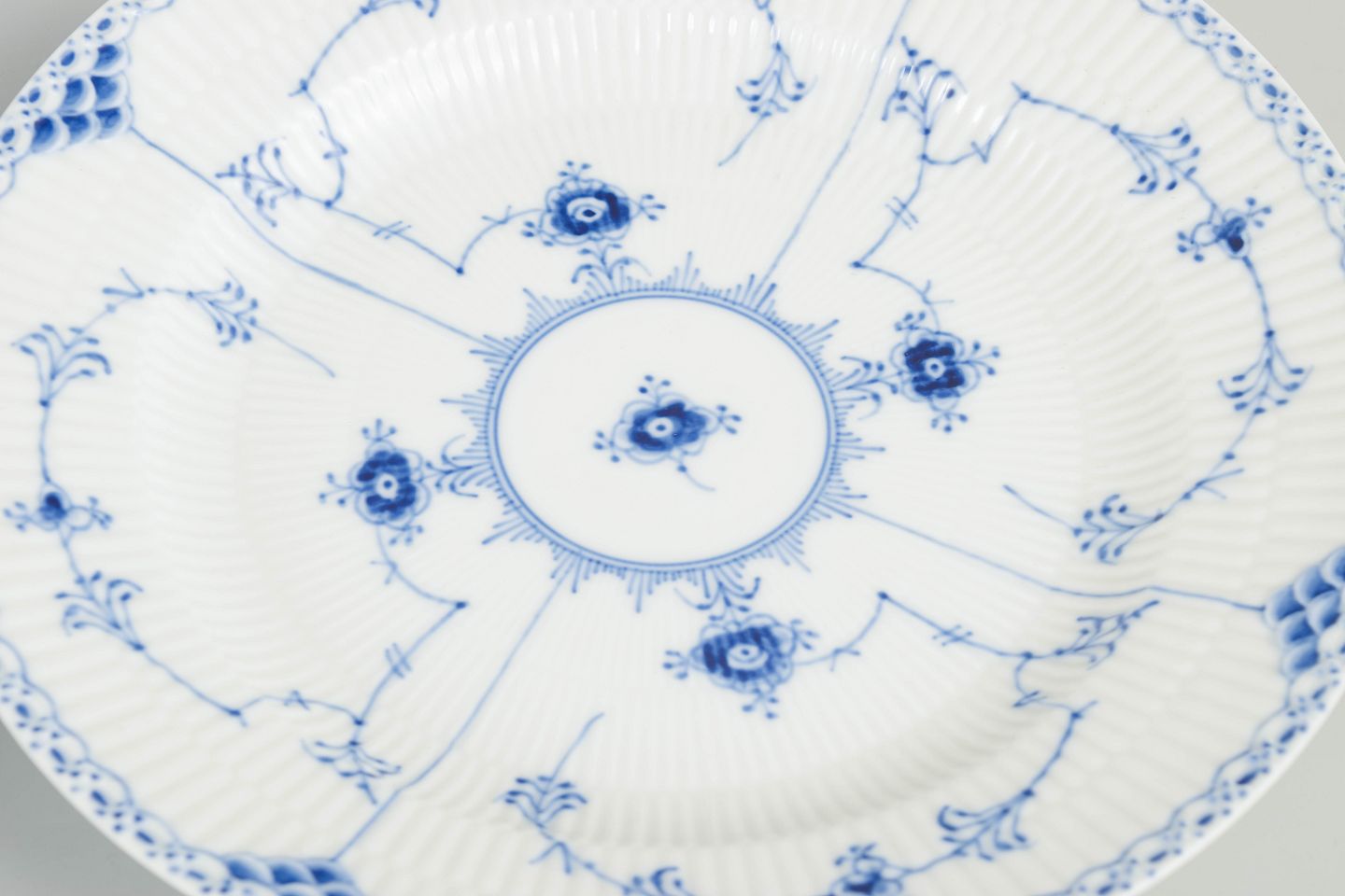 Royal Copenhagen blev grundlagt i 1775 i København under kongelig bevilling. Fabrikken er internationalt anerkendt for sit håndmalede porcelæn og sit høje kunstneriske niveau. Musselmalet Halvblonde er en variation af det klassiske Musselmalet stel og kombinerer riflede flader med en dekorativ blondekant, udført med stor håndværksmæssig præcision.