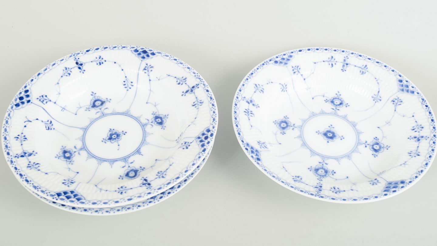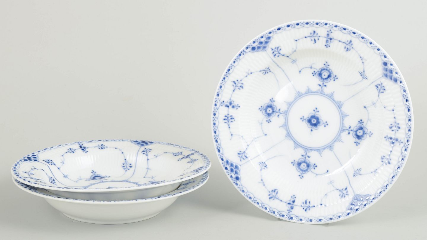 Royal Copenhagen Musselmalet Halvblonde, sæt af tre dybe tallerkener.