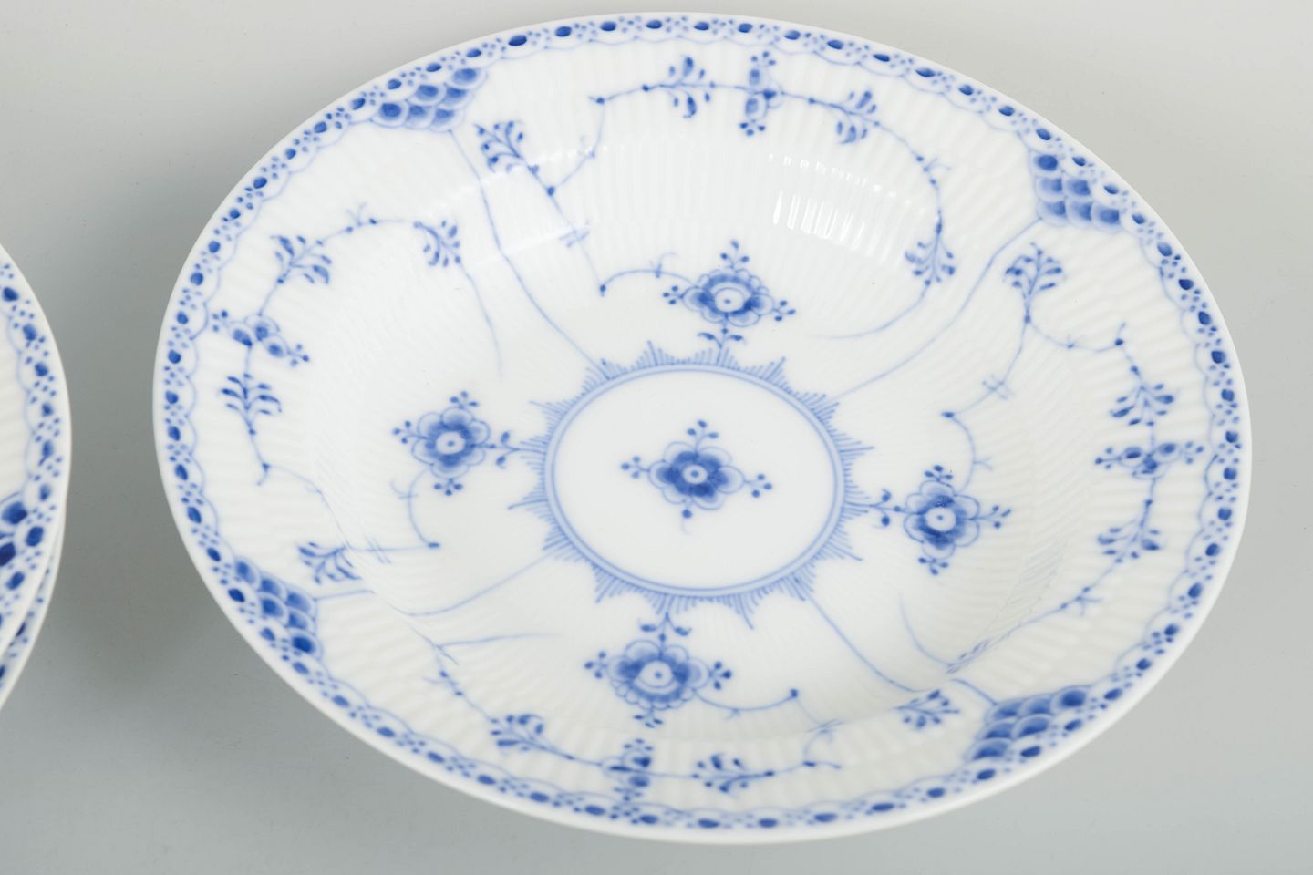 Royal Copenhagen Musselmalet Halvblonde, sæt af tre dybe tallerkener.Sæt af tre dybe tallerkener i håndmalet porcelæn fra Musselmalet Halvblonde med klassisk underglasurdekoration i koboltblå, riflede felter og karakteristisk blondekant. Model 1/566. Annulleret med én indridset streg under bunden.