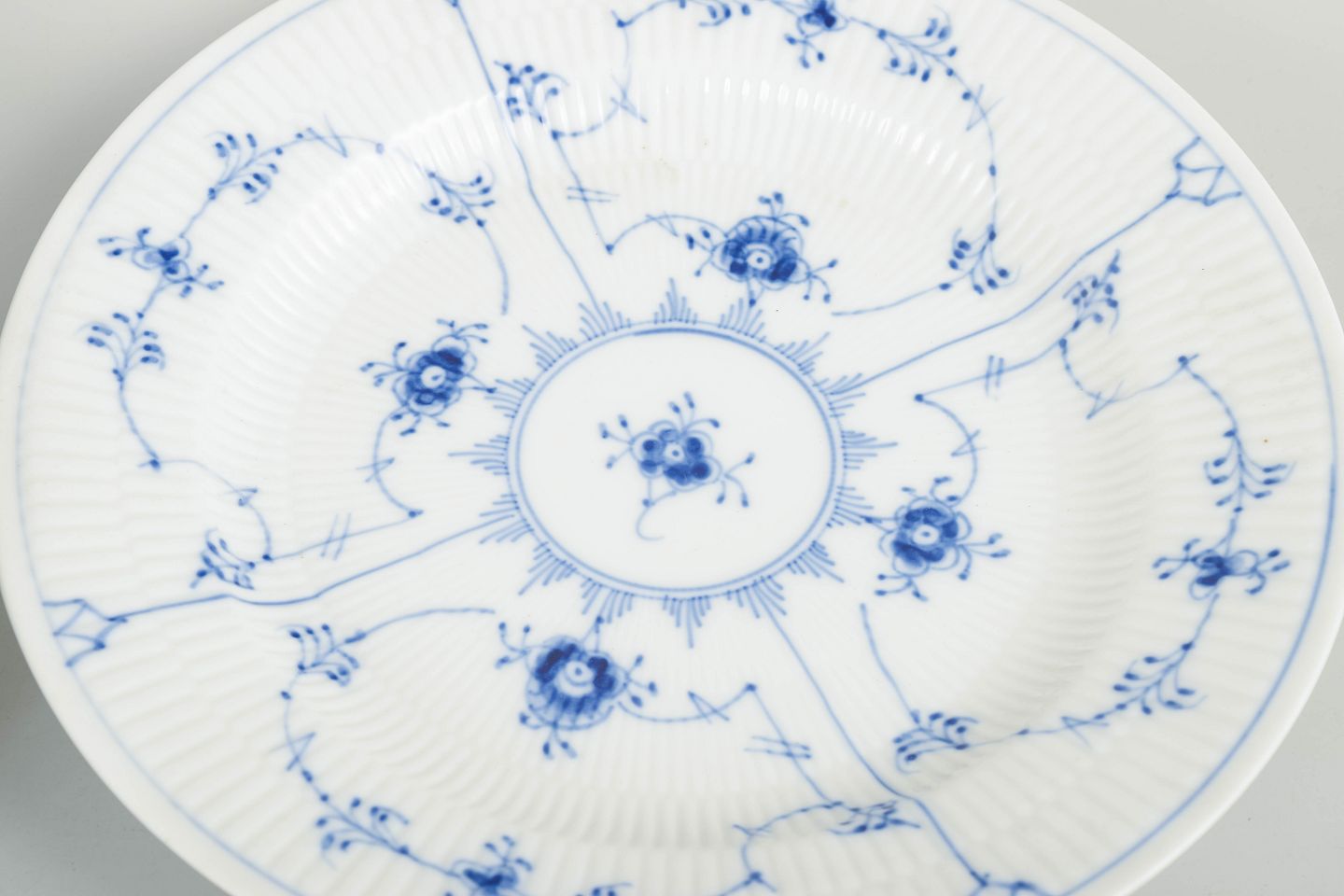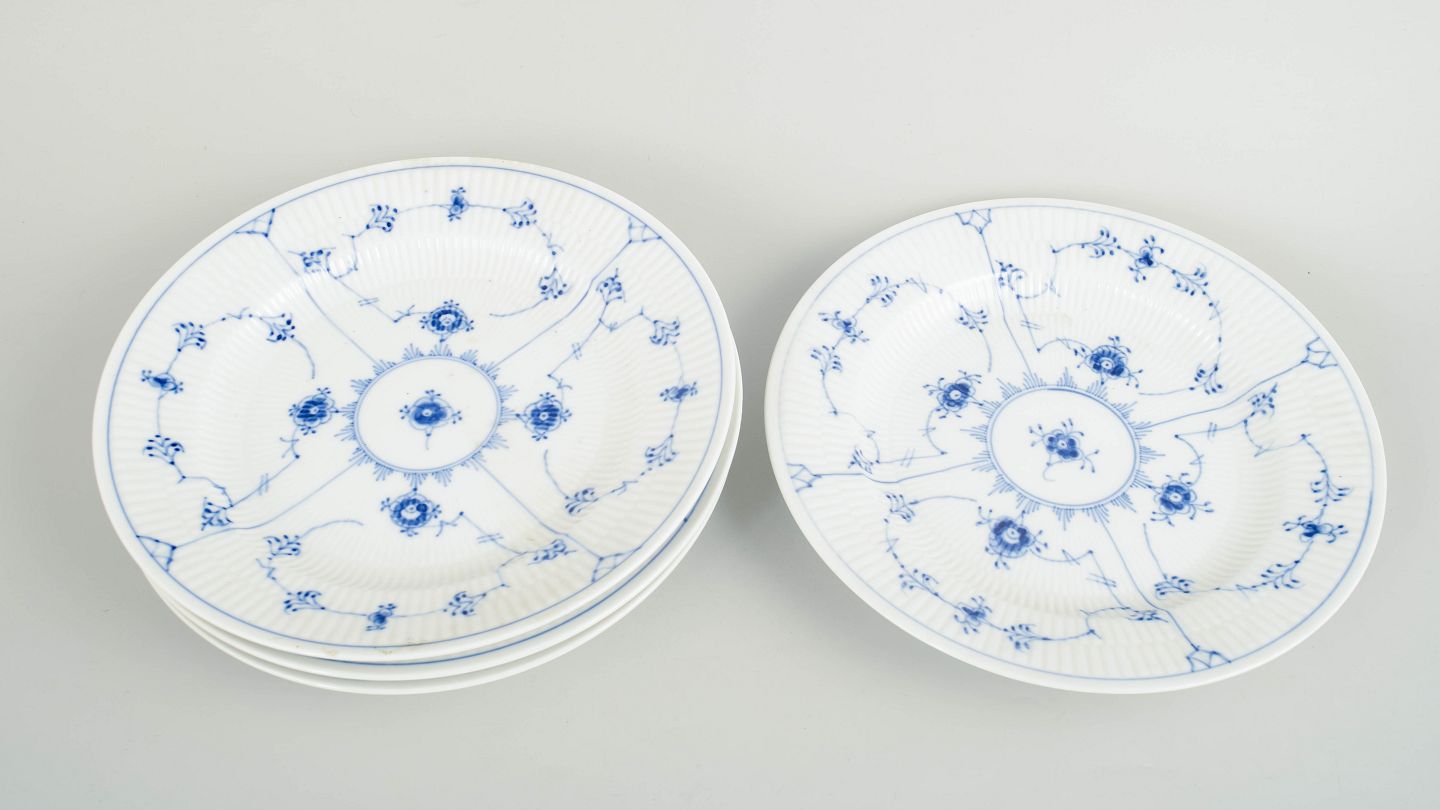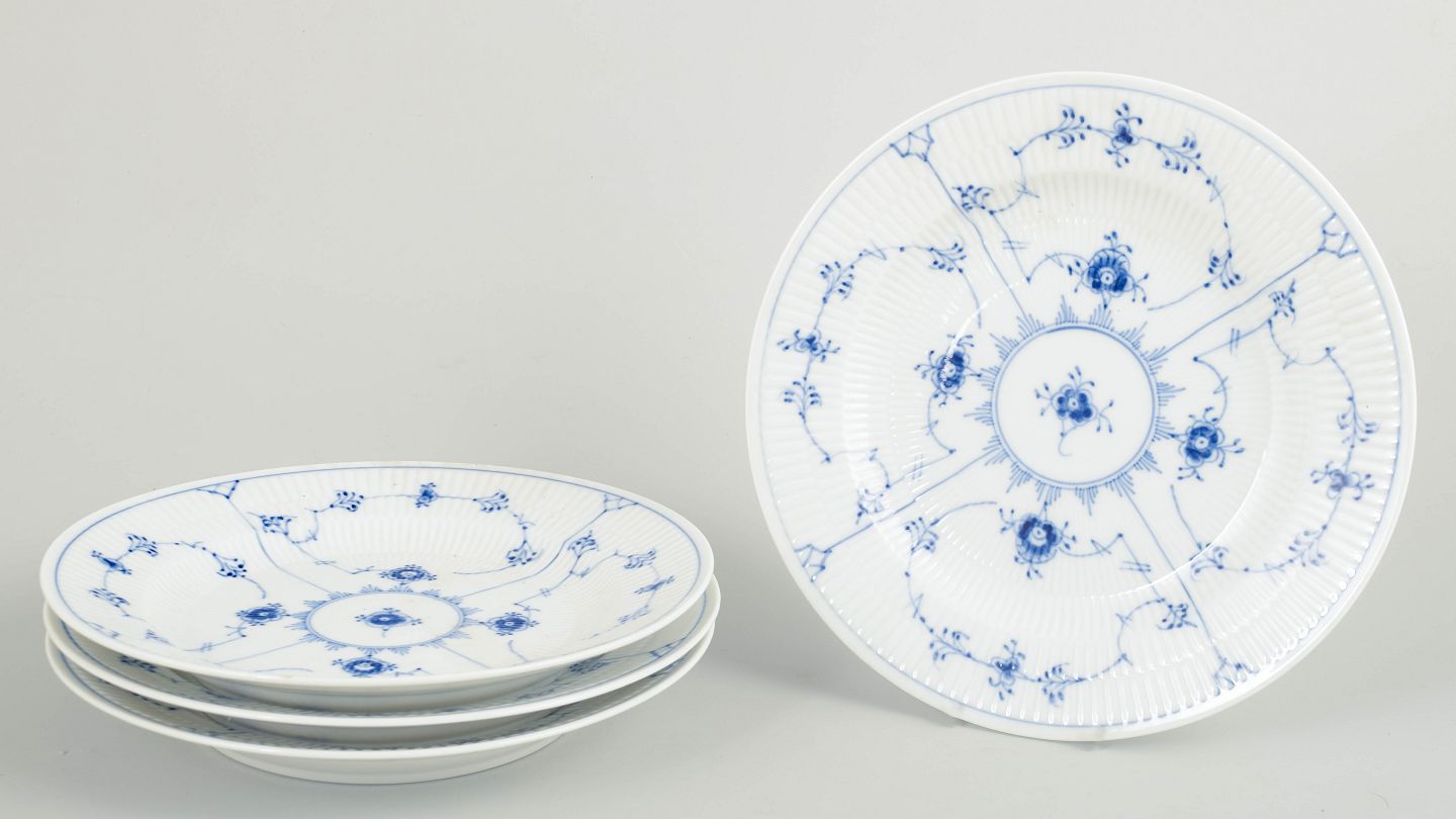Royal Copenhagen Musselmalet Riflet, sæt af fire middagstallerkener.