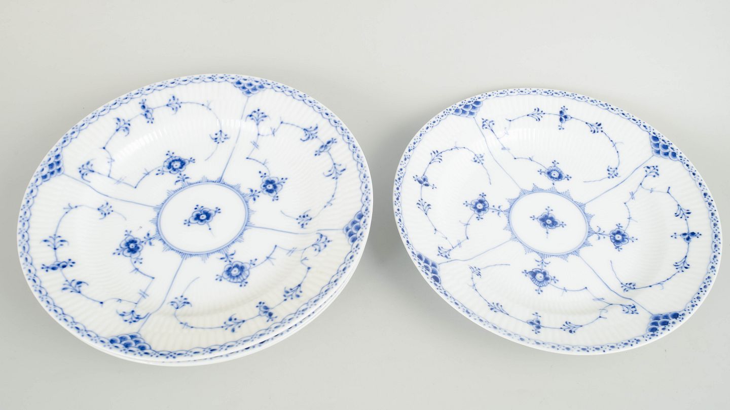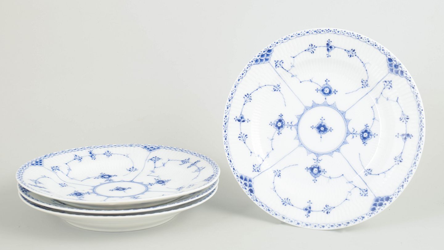 Royal Copenhagen Musselmalet Halvblonde, sæt af fire middagstallerkener.Beschreibung: