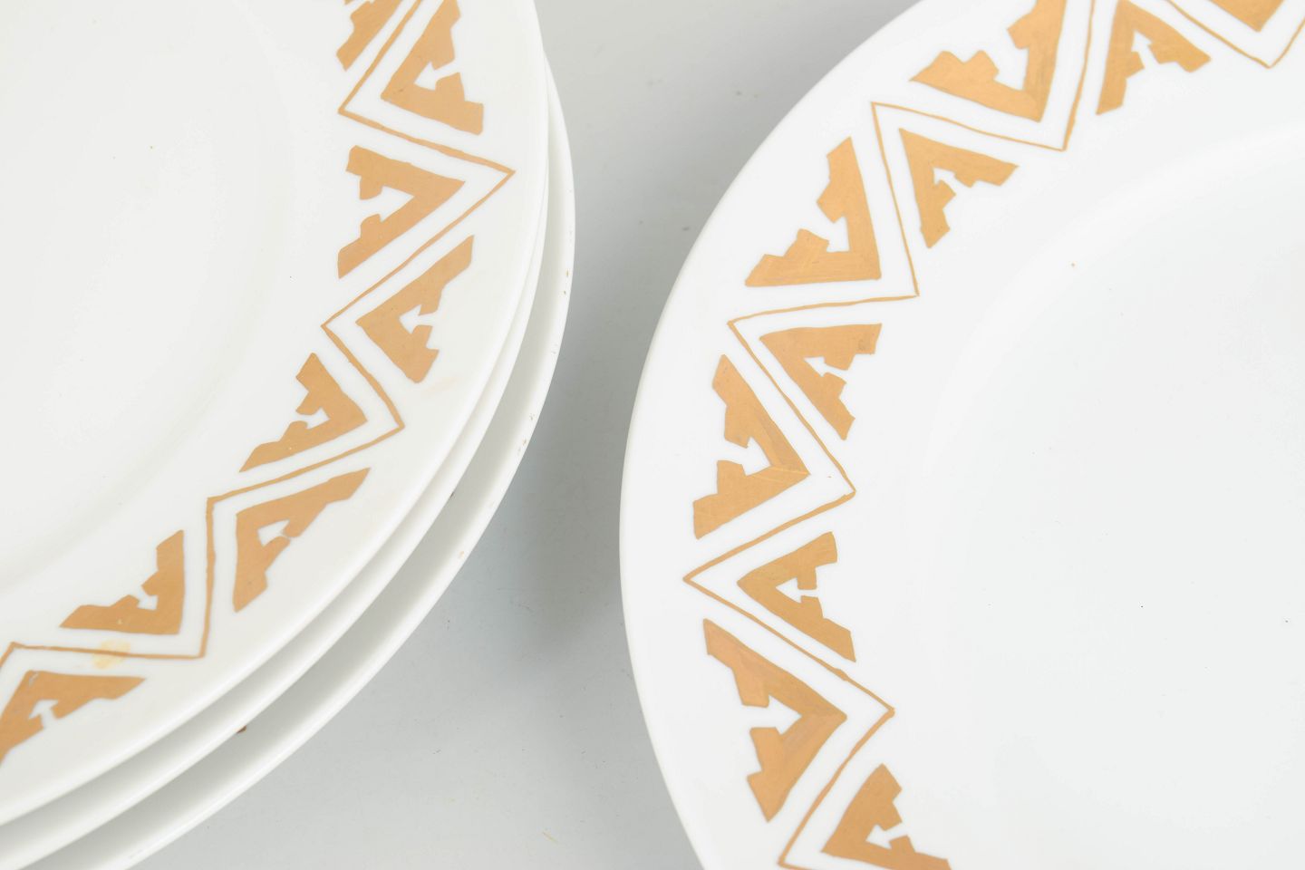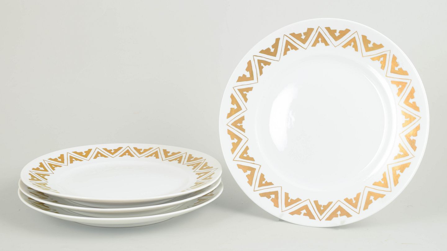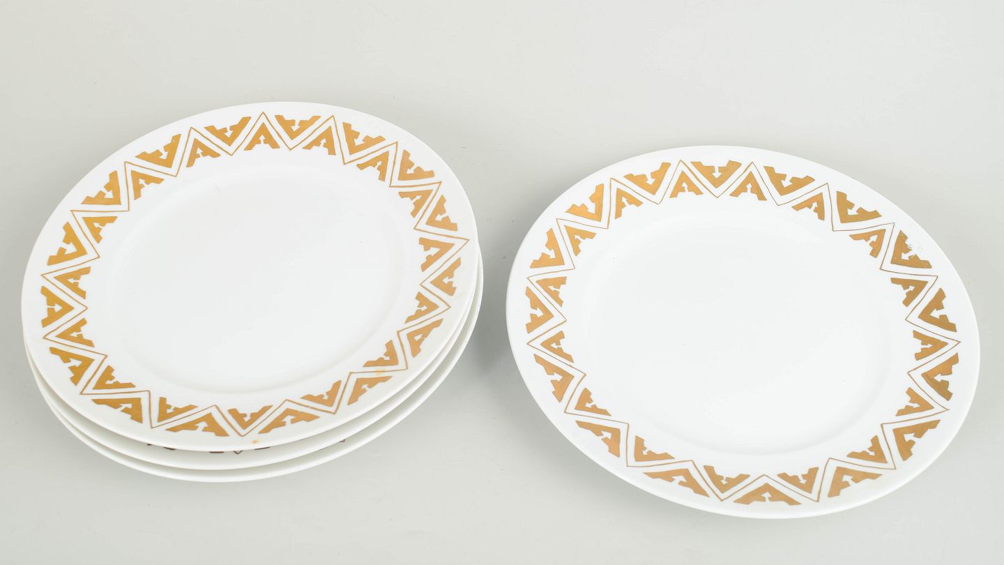 Royal Copenhagen sæt af fire store middagstallerkener.Sæt af fire store middagstallerkener i porcelæn med geometrisk dekoration i Art Deco stil langs fanen. Annulleret med to indridsede streger under bunden. Fremstillet i 1959.
