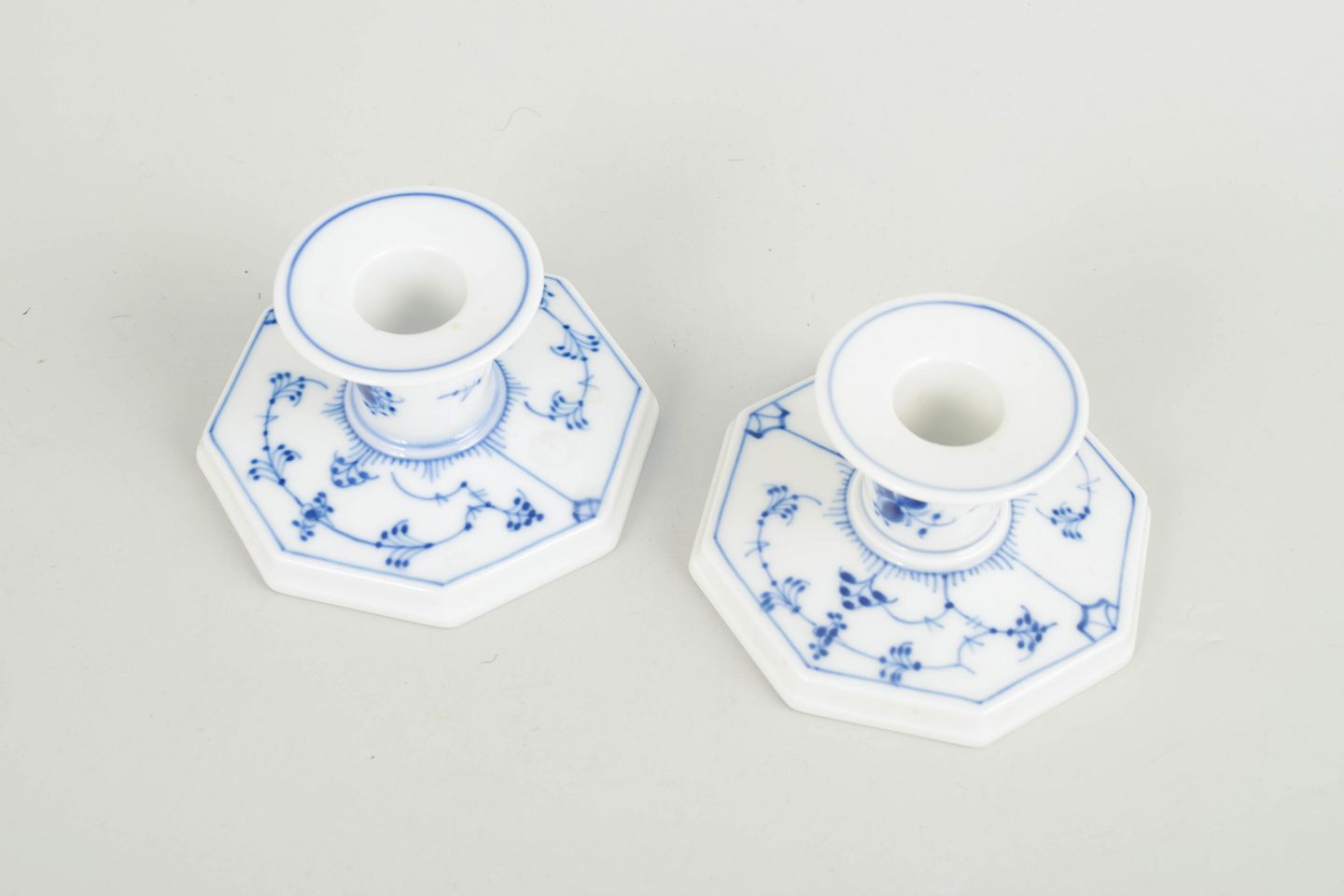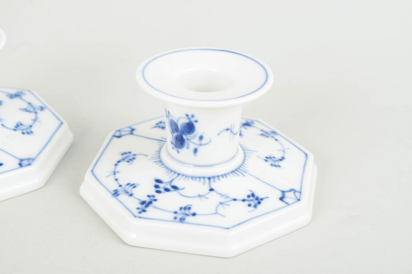 Royal Copenhagen Musselmalet Riflet, et par lysestager.Et par lysestager i håndmalet porcelæn fra Musselmalet Riflet med klassisk underglasurdekoration i koboltblå.