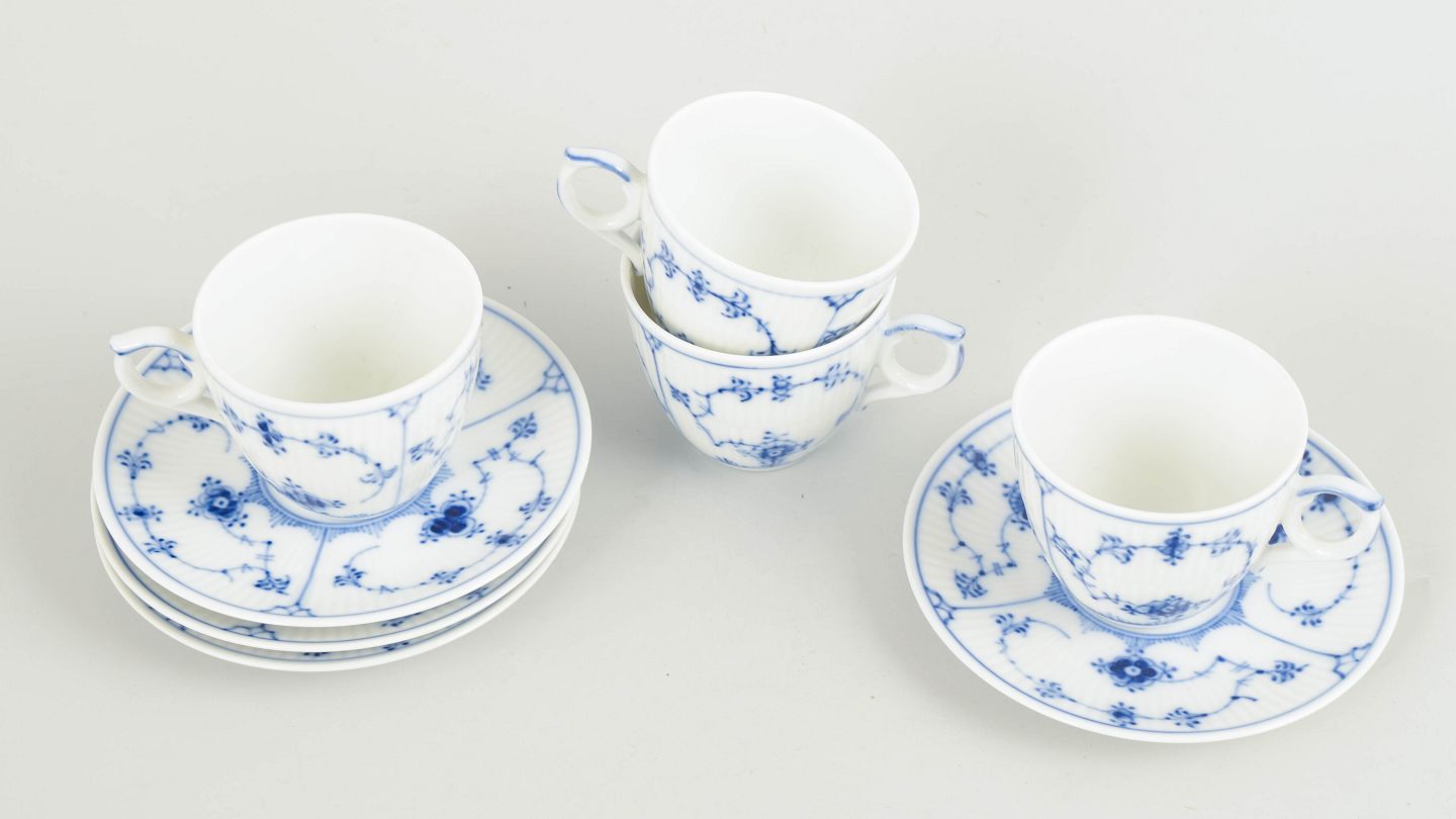 Royal Copenhagen Musselmalet Riflet, sæt af fire mokkakopper med underkopper.Sæt af fire mokkakopper med tilhørende underkopper i håndmalet porcelæn fra Musselmalet Riflet med klassisk underglasurdekoration i koboltblå.