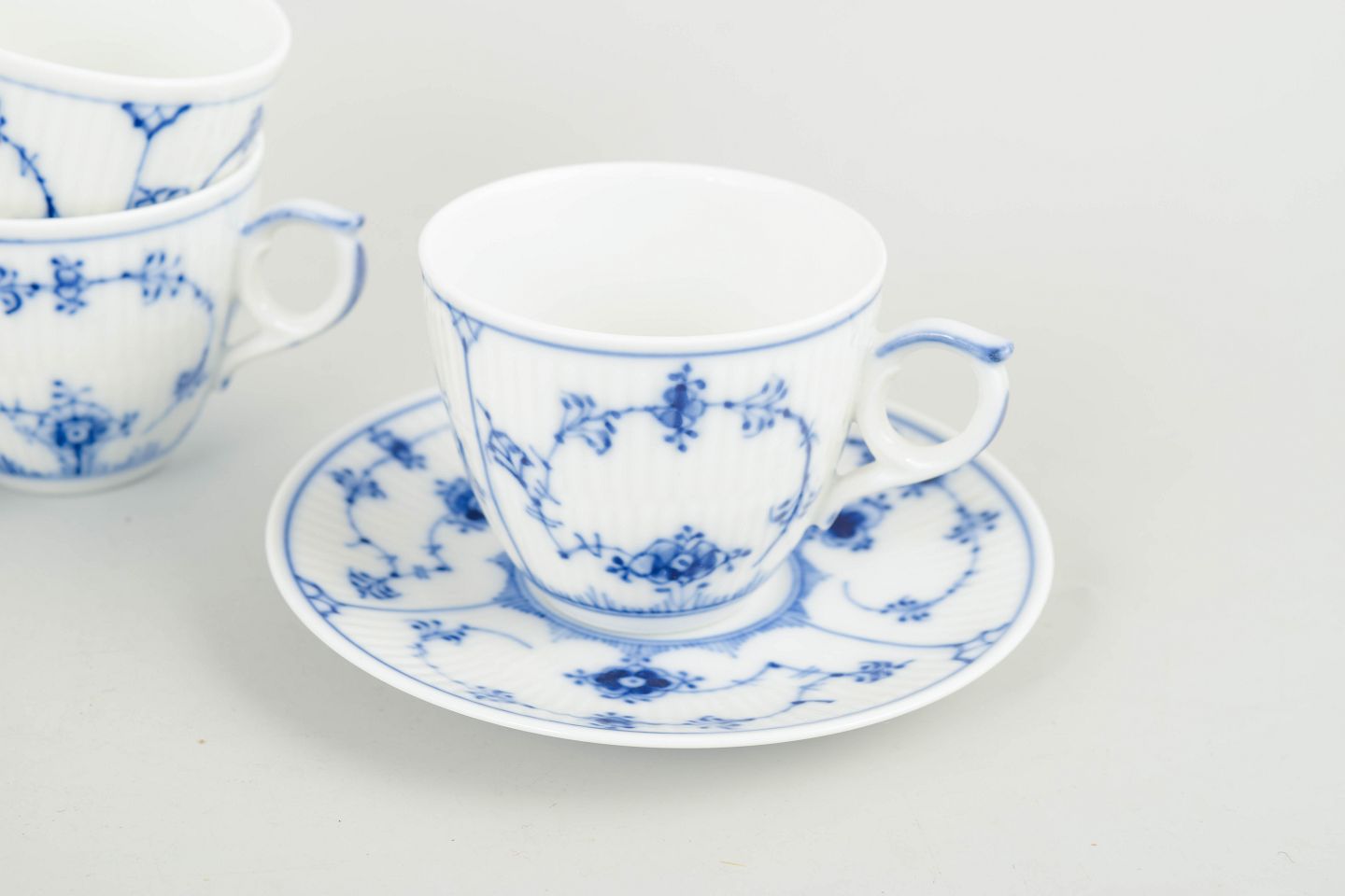 Royal Copenhagen Musselmalet Riflet, sæt af tre mokkakopper med underkopper.