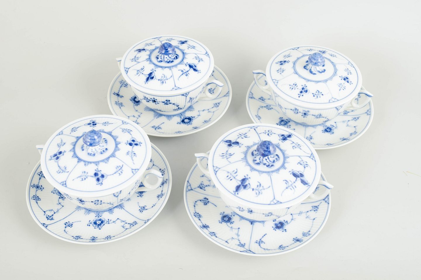 Royal Copenhagen Musselmalet Riflet sæt på fire bouillon-kopper med tilhørende underkopper.