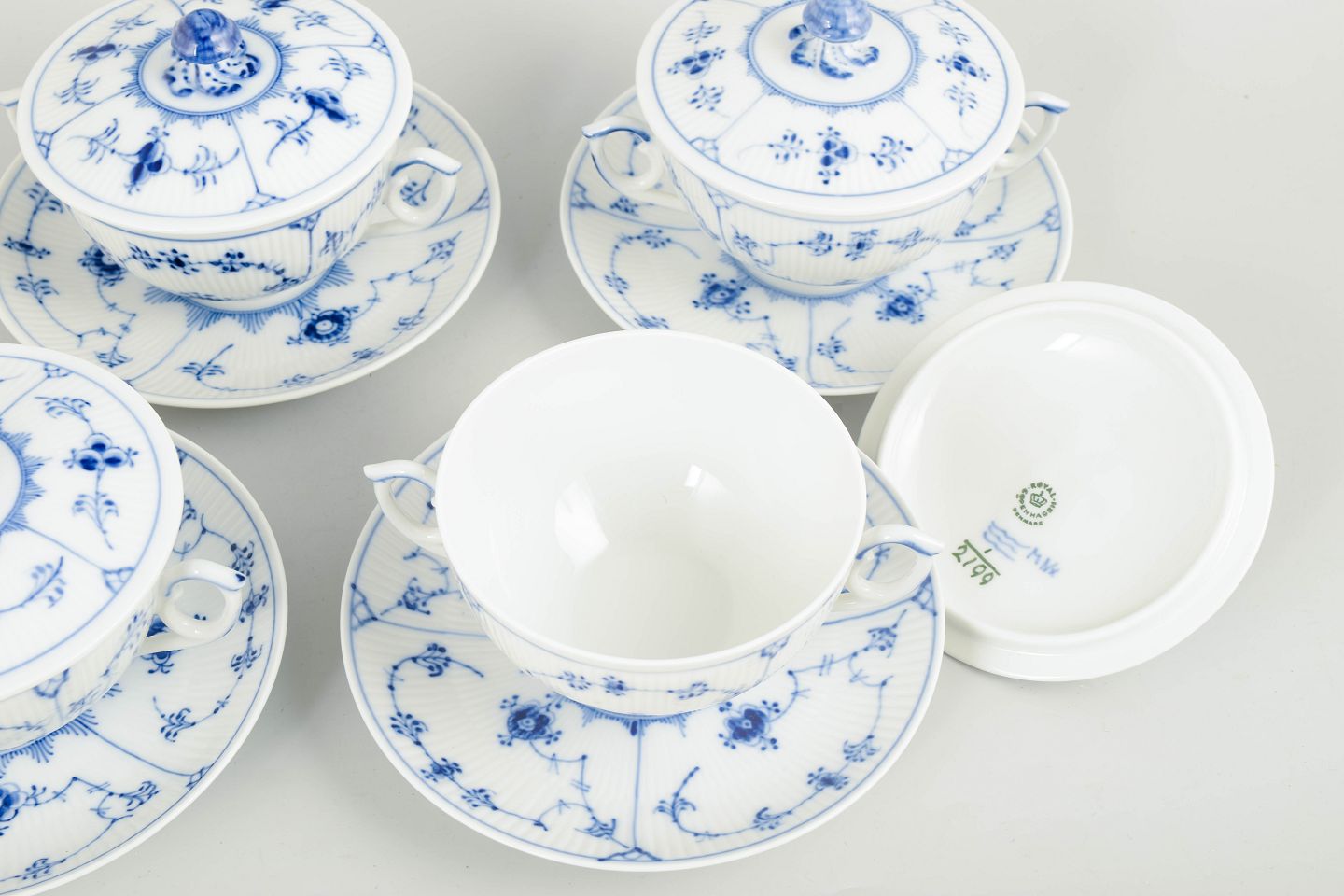 Royal Copenhagen Musselmalet Riflet, sæt på fire bouillon-kopper med tilhørende underkopper.Sæt på fire bouillonkopper med tilhørende underkopper i håndmalet porcelæn fra Musselmalet Riflet med klassisk underglasurdekoration i koboltblå. Model 1/2199. Nogle dele er første sortering, andre er annulleret med én indridset streg under bunden.