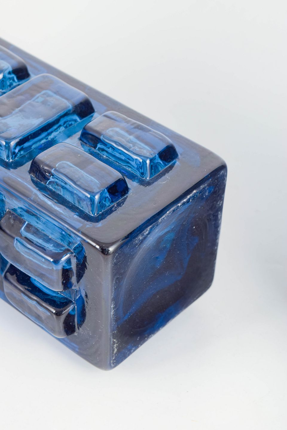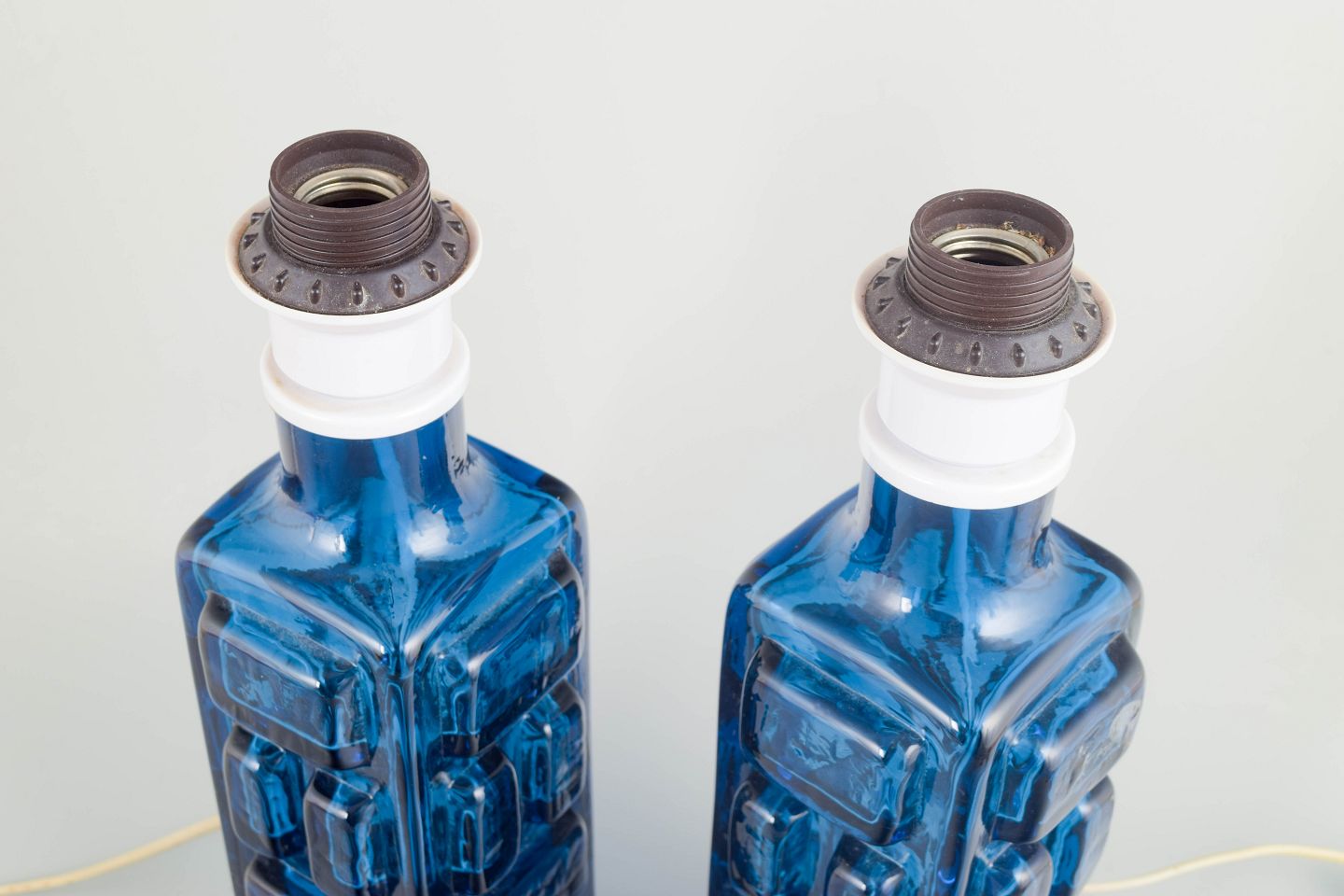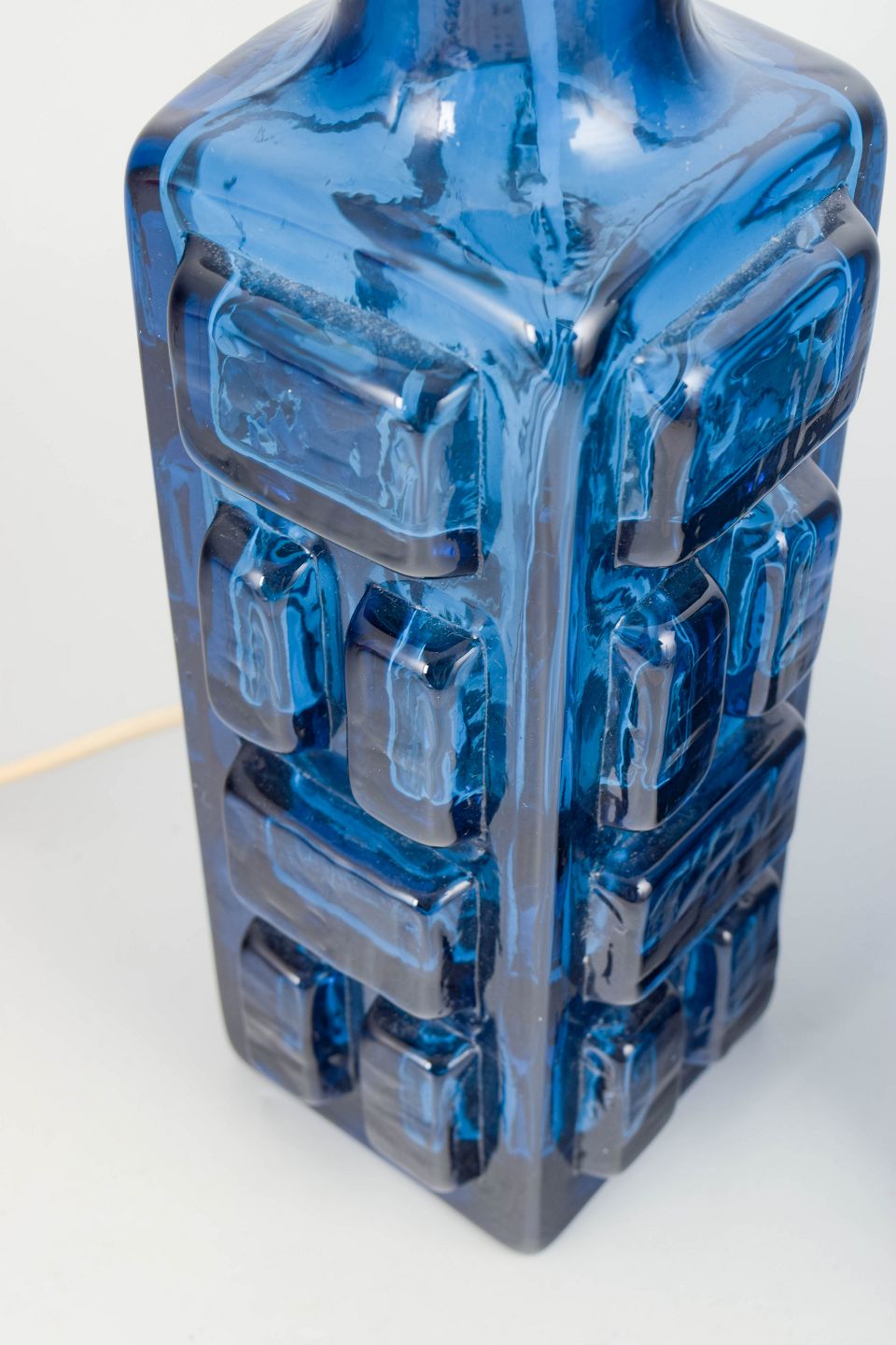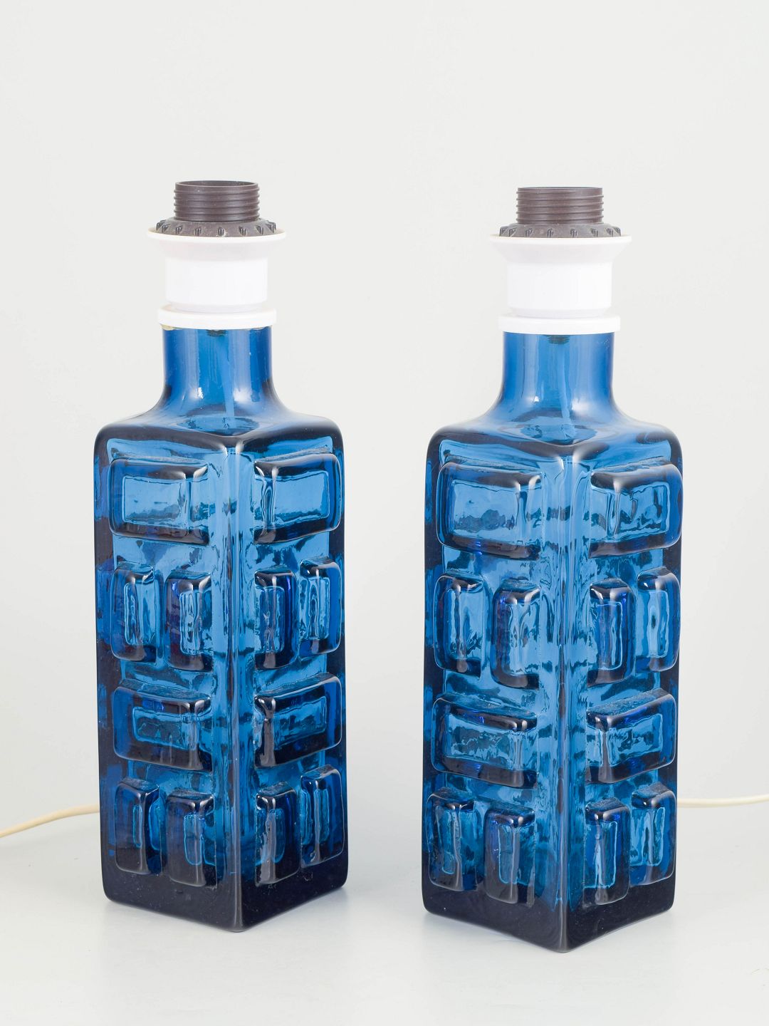 Pukeberg, par svenske kunstglas bordlamper.Par bordlamper i blåt presset glas med geometrisk reliefdekoration. Fremstillet hos Pukeberg i Sverige i 1970’erne.