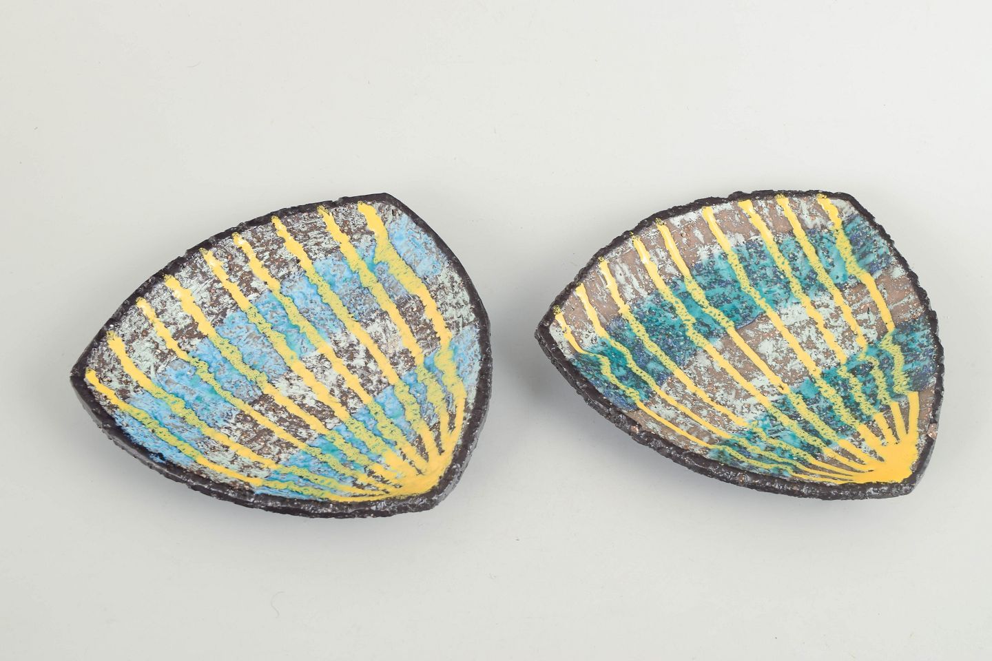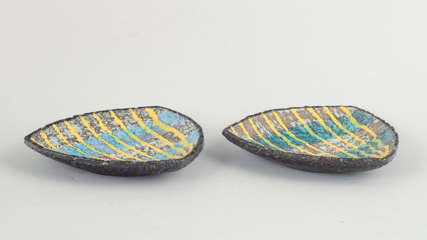 Ingrid Atterberg for Upsala Ekeby, to fade.To mindre ovale keramikfade model 2548, udført i stentøj med reliefdekoration og flerfarvet glasur i blå og gule nuancer.