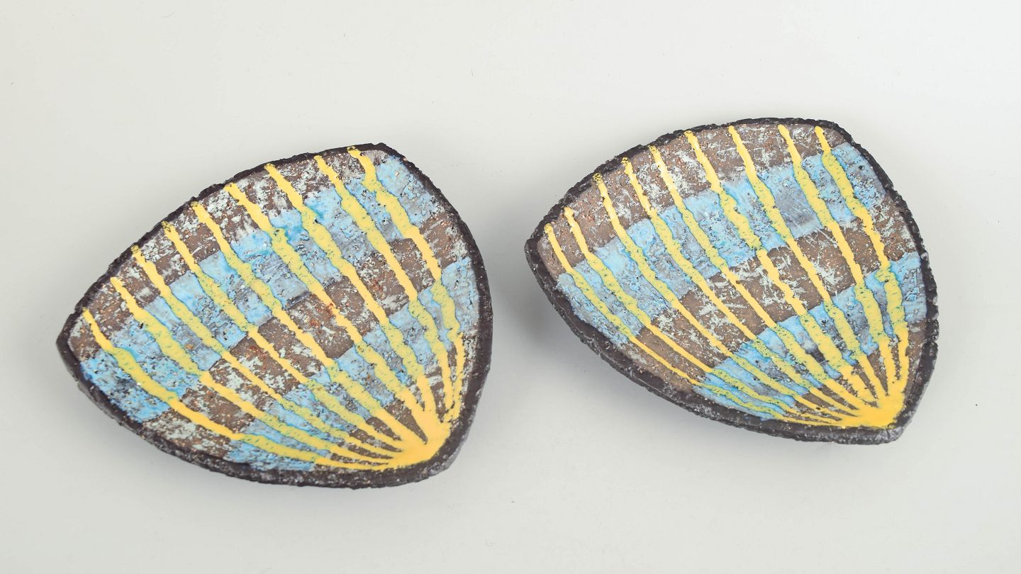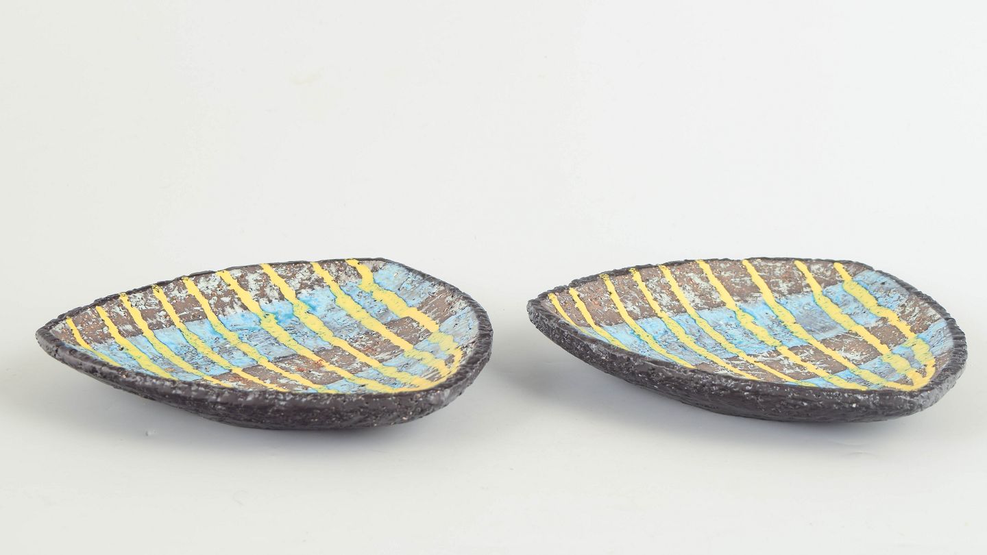 Ingrid Atterberg for Upsala Ekeby, to fade.To mindre ovale keramikfade model 2548, udført i stentøj med reliefdekoration og flerfarvet glasur i blå og gule nuancer.