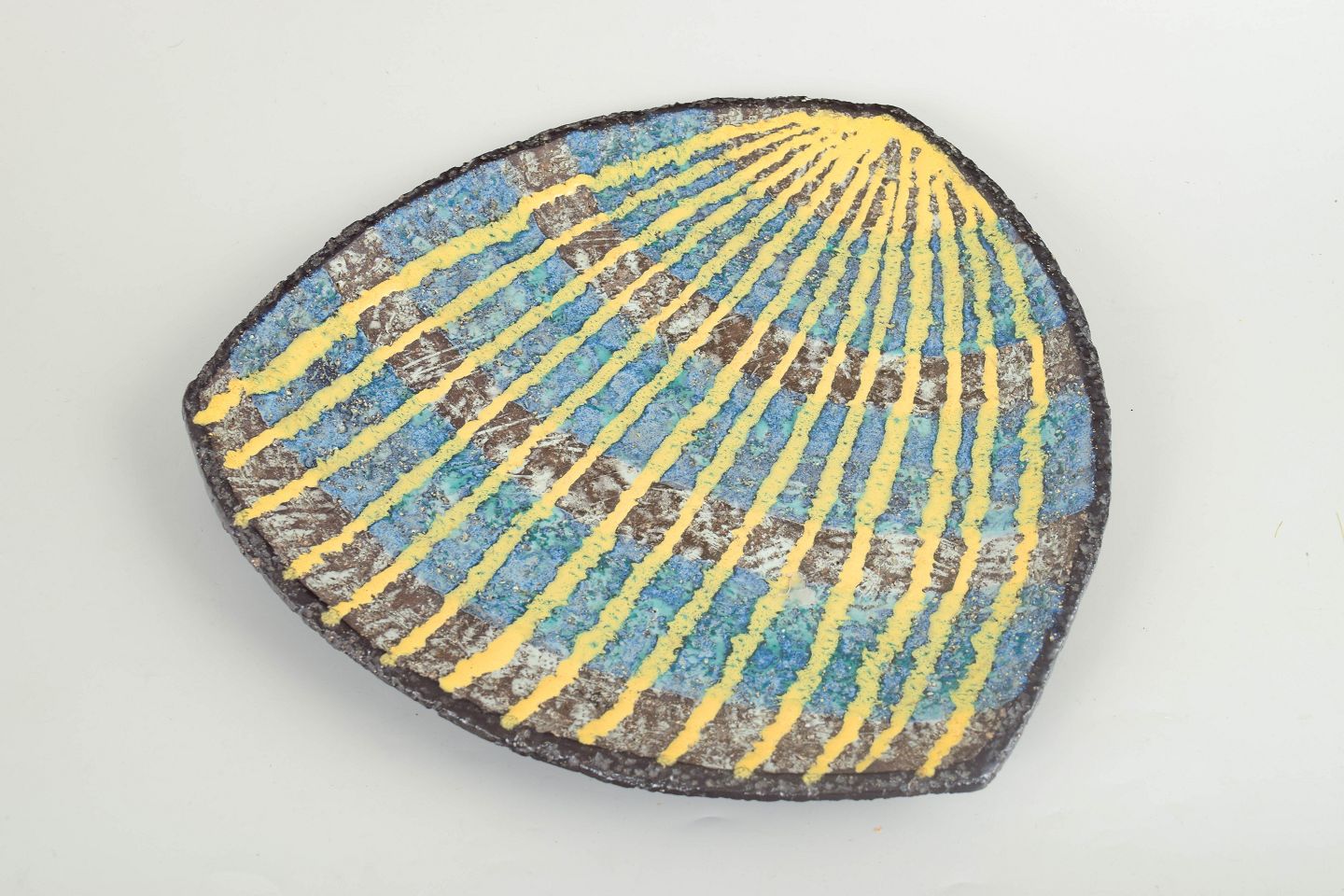 Ingrid Atterberg for Upsala Ekeby, stort fad.Stort ovalt keramikfad med modelnummer 2350, udført i stentøj med reliefdekoration og flerfarvet glasur i blå og gule nuancer.