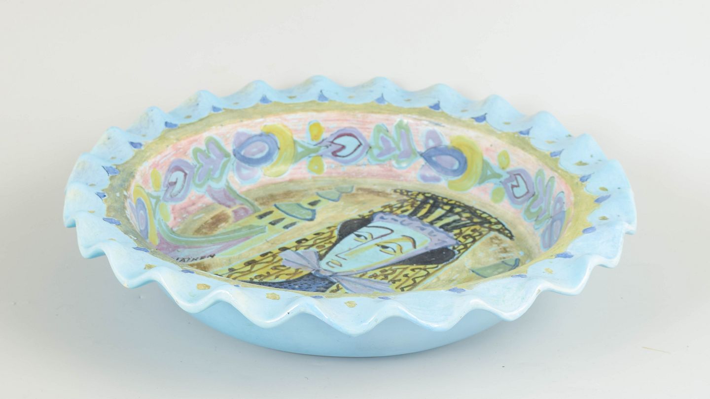 Birger Kaipiainen for Arabia, stor unika skål.Stor hånddekoreret keramisk skål med bølget rand og polykrom dekoration forestillende stiliseret kvindefigur omgivet af ornamentale motiver.