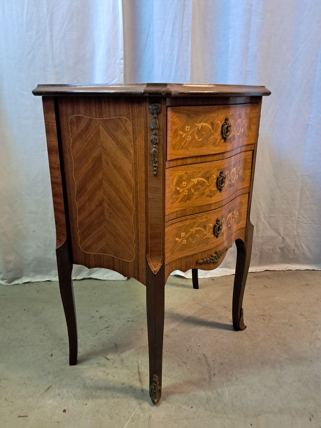 Kommode i fineret mahogni med intarsia, fra 1980erne.Den har brugsspor.