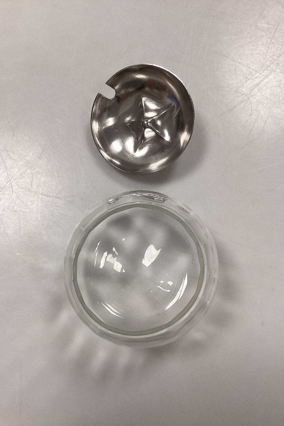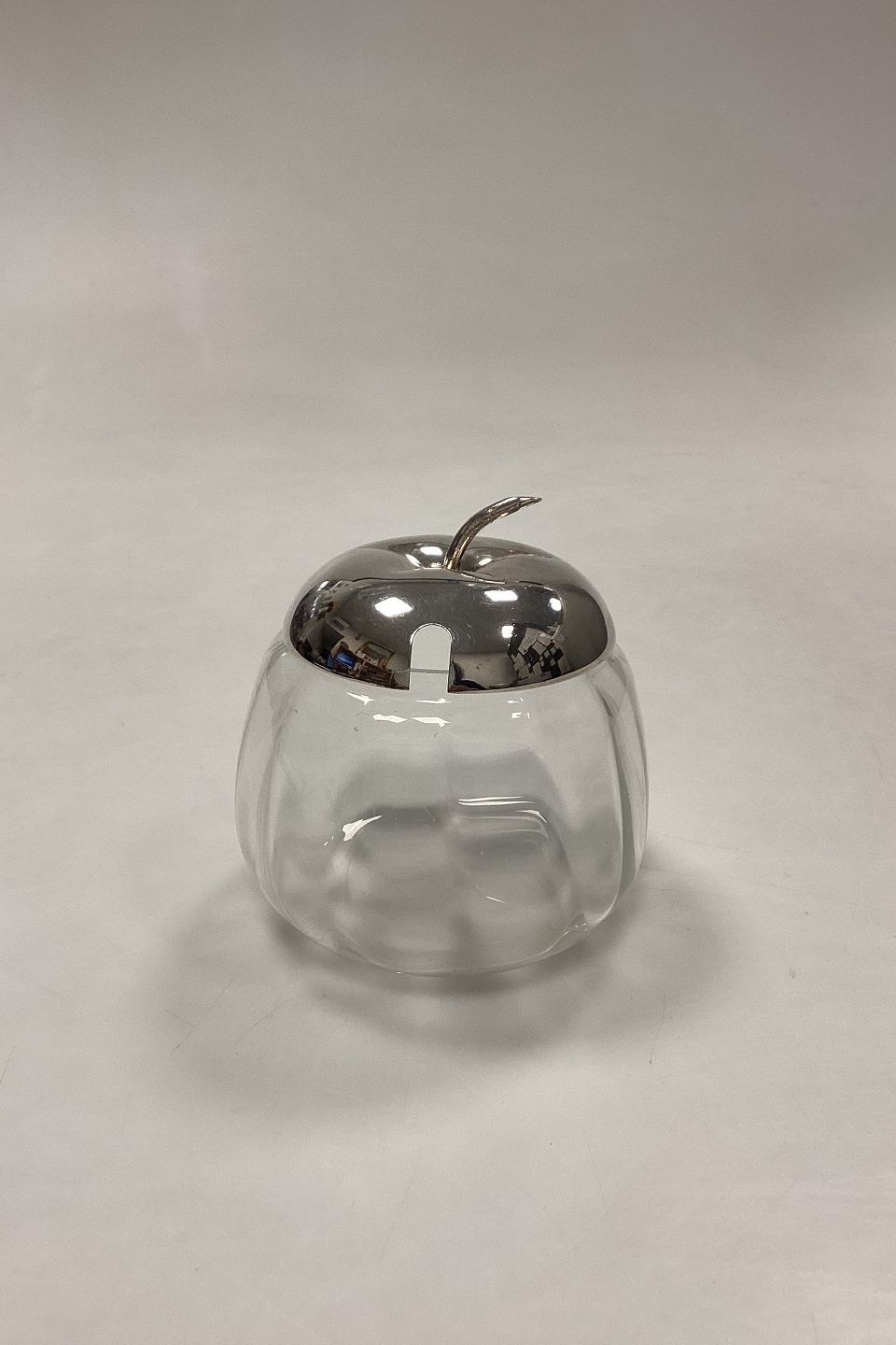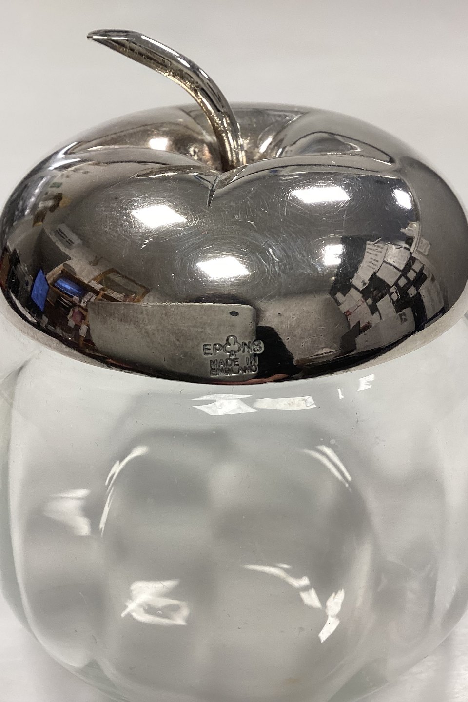 Engelsk Sølvplet/EPNS Marmeladekrukke. Glasset har optiske riller, og låget er formet som toppen af et æble.Måler 10 cm / 3,94 in. med stilk x 9,4 cm / 3,70 in. i dia.