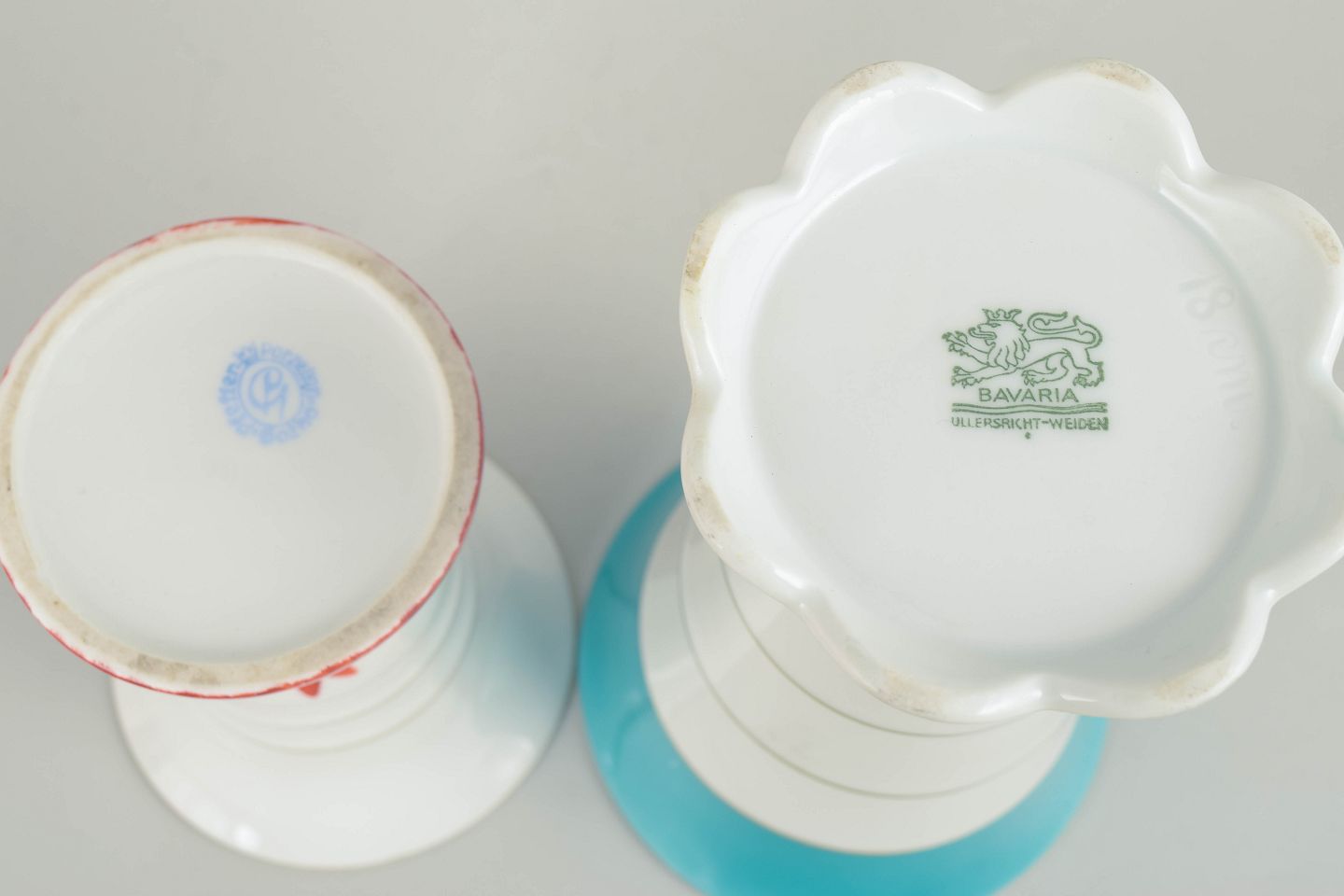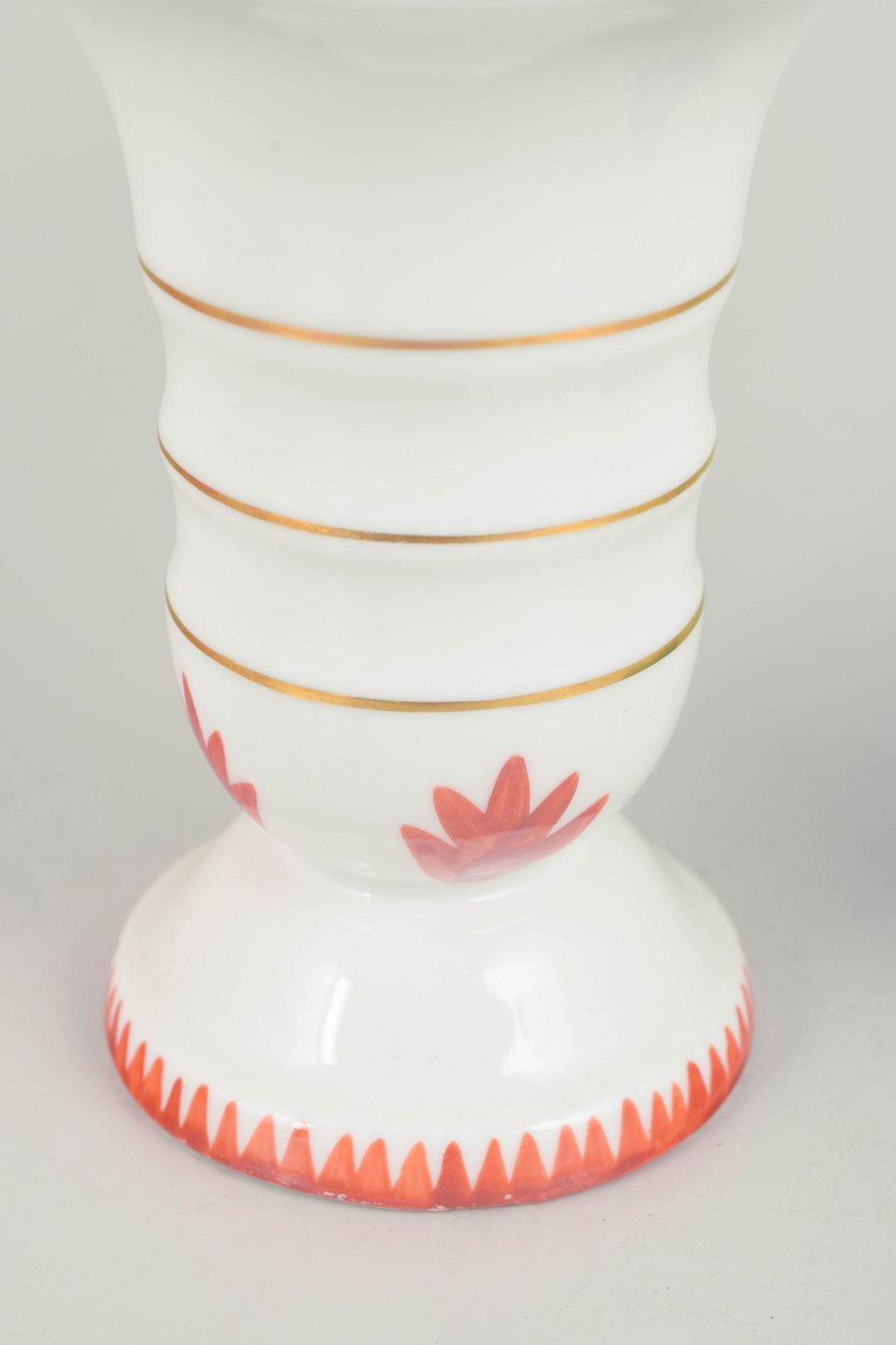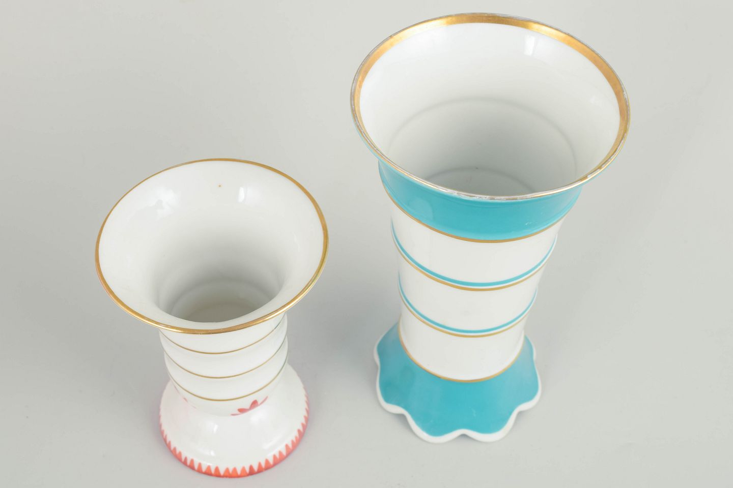 To tyske art deco vaser.To vaser i porcelæn med klassiske art deco former og dekoration i hvide, turkise og røde nuancer med stafferinger i guld. Vaserne fremstår med elegante proportioner og karakteristisk stil fra tysk porcelænsproduktion i mellemkrigstiden.