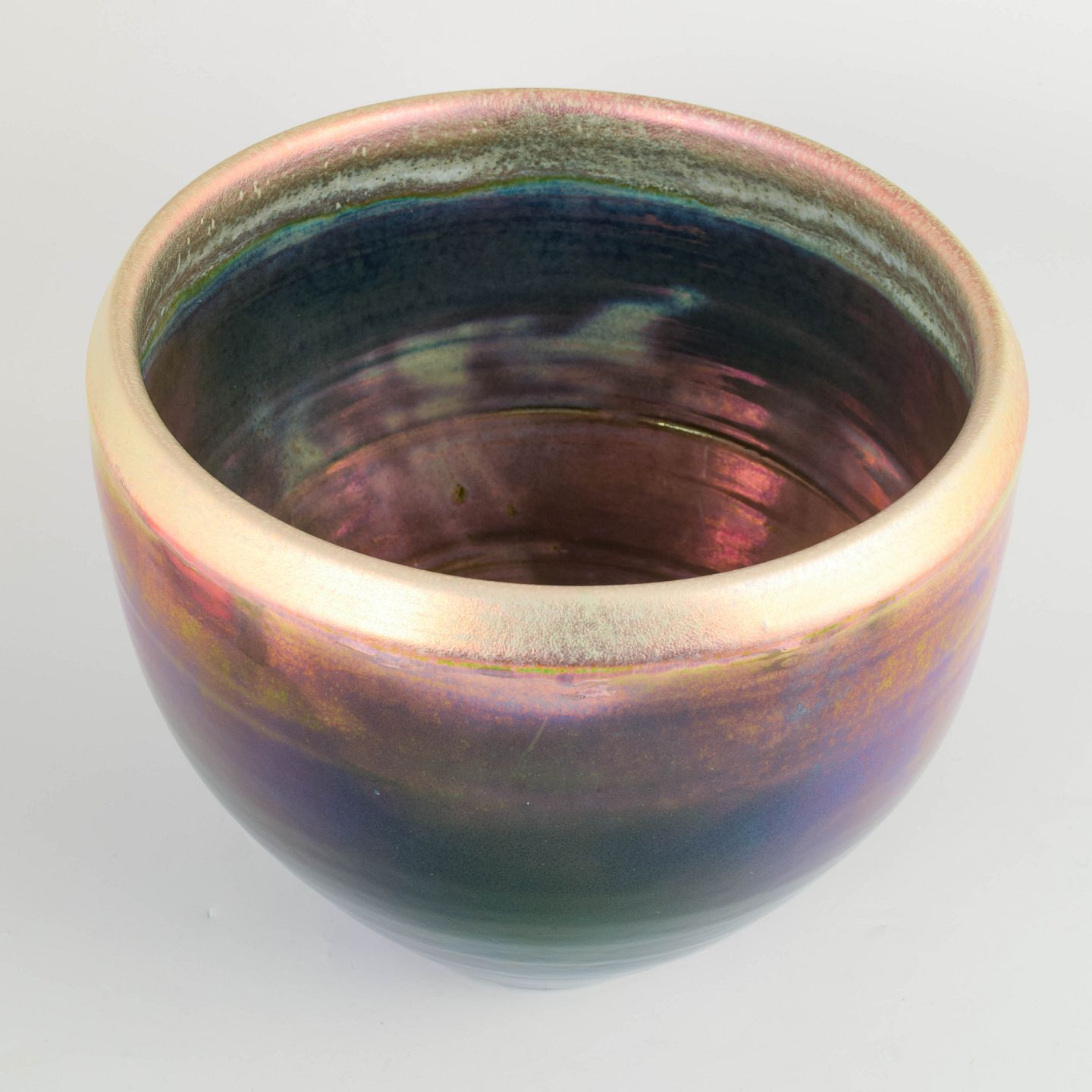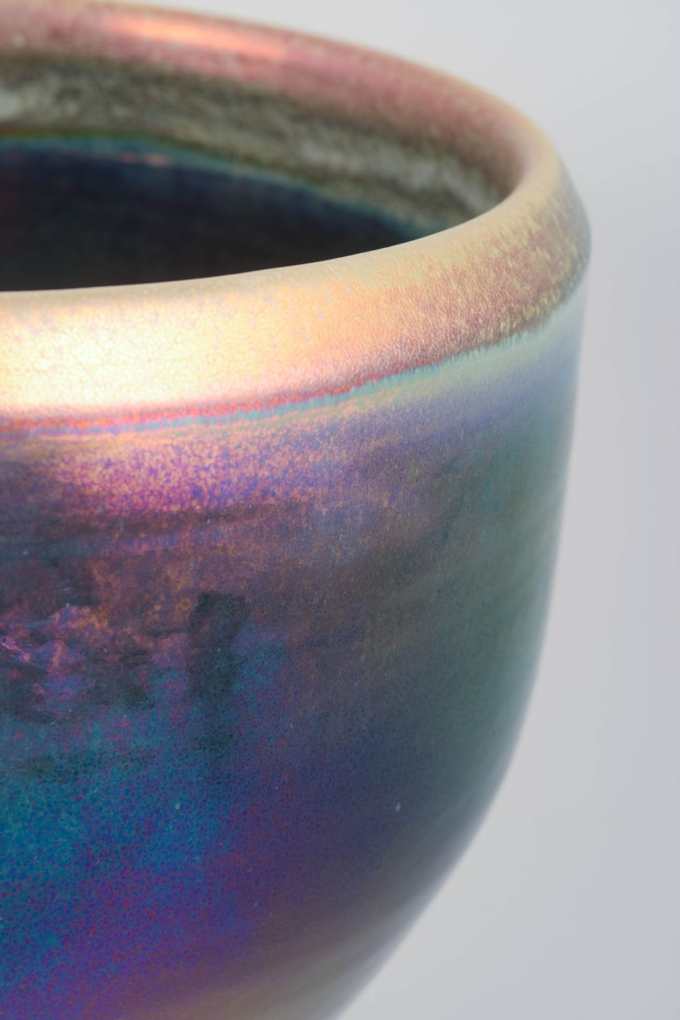 Mobach stor gulvvase i keramik.Meget stor drejet gulvvase eller plantekrukke i kraftigt stentøj med blank flerfarvet luster-glasur i violette, blå, grønne og rosa nuancer. Fremstillet hos Mobach i 1970’erne.