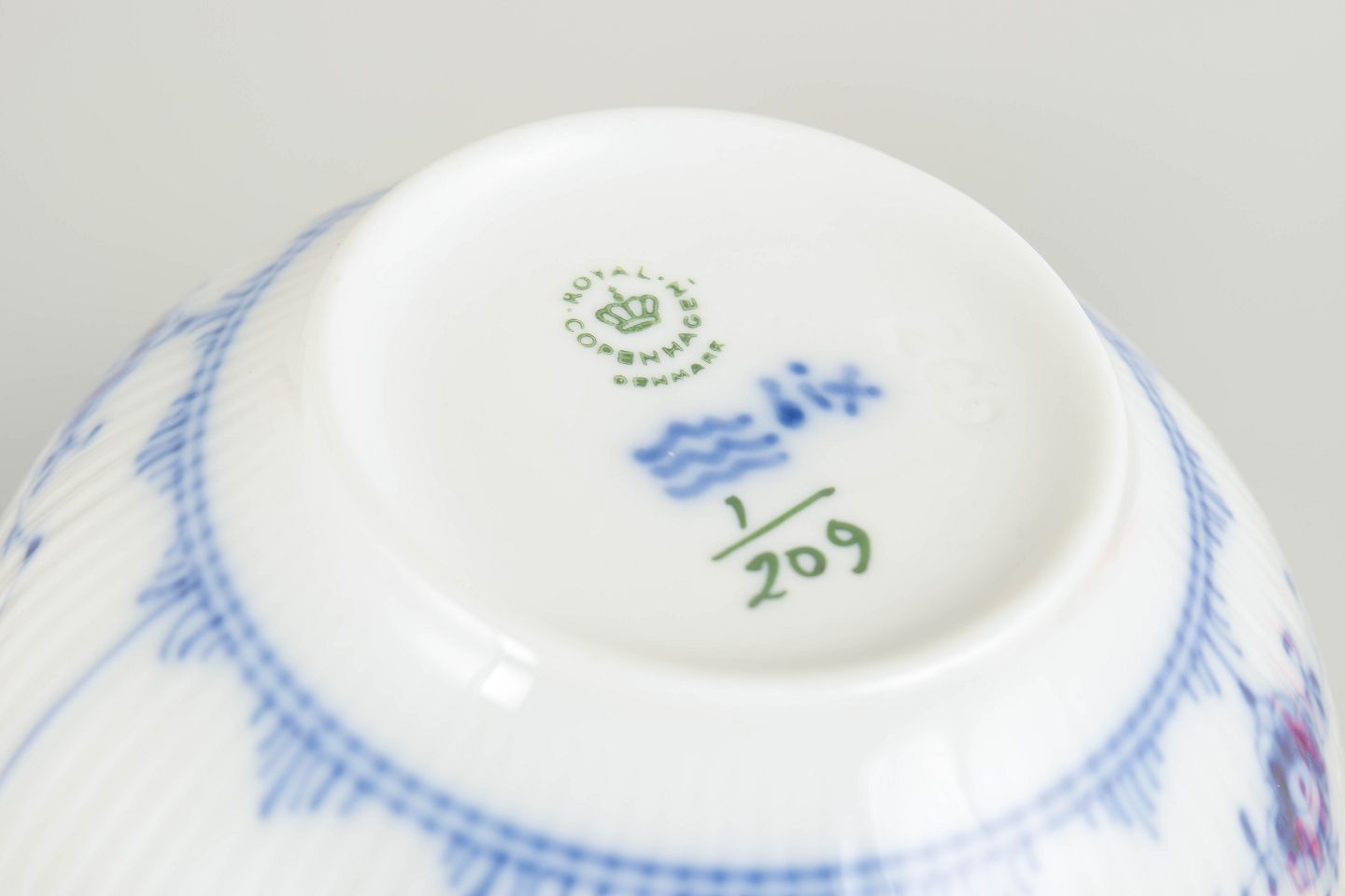 Royal Copenhagen blev grundlagt i 1775 i København under kongelig bevilling. Fabrikken er internationalt anerkendt for sit håndmalede porcelæn og sit høje kunstneriske niveau. Musselmalet Riflet er fabrikkens mest klassiske stel, introduceret i slutningen af 1700-tallet og fortsat produceret med traditionelle håndværksmetoder.