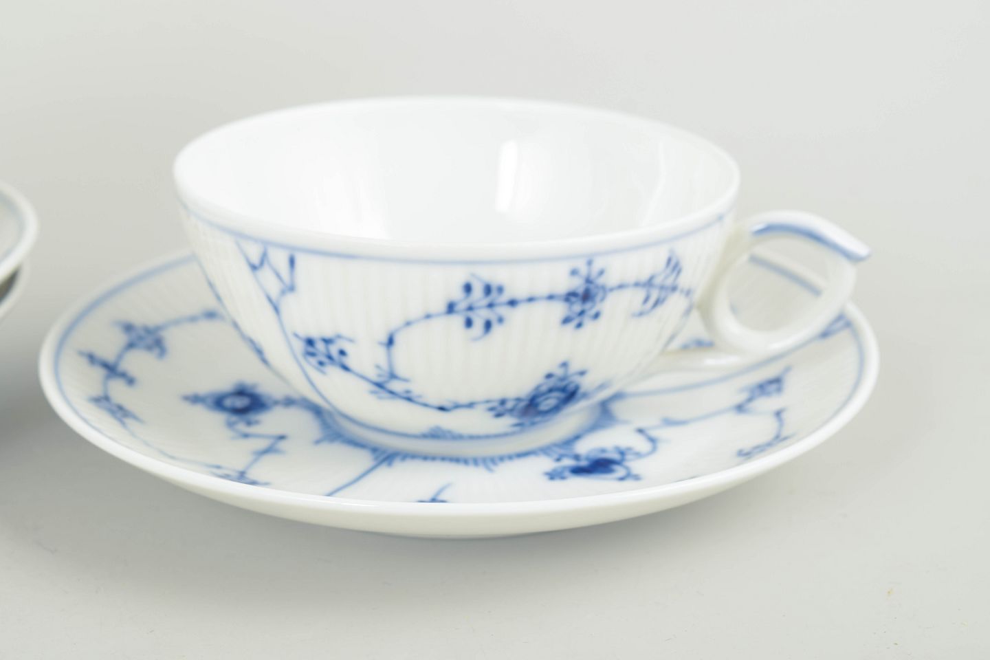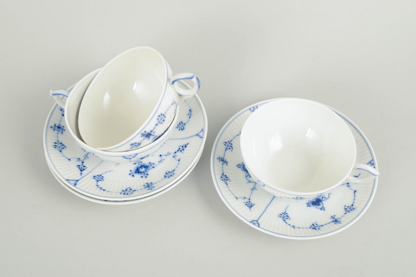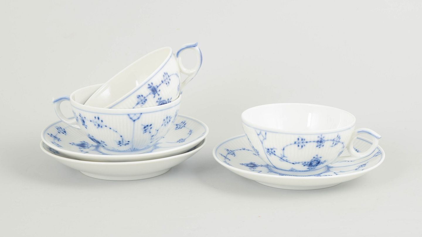 Royal Copenhagen Musselmalet Riflet sæt af tre tekopper med tilhørende underkopper.Beschreibung: