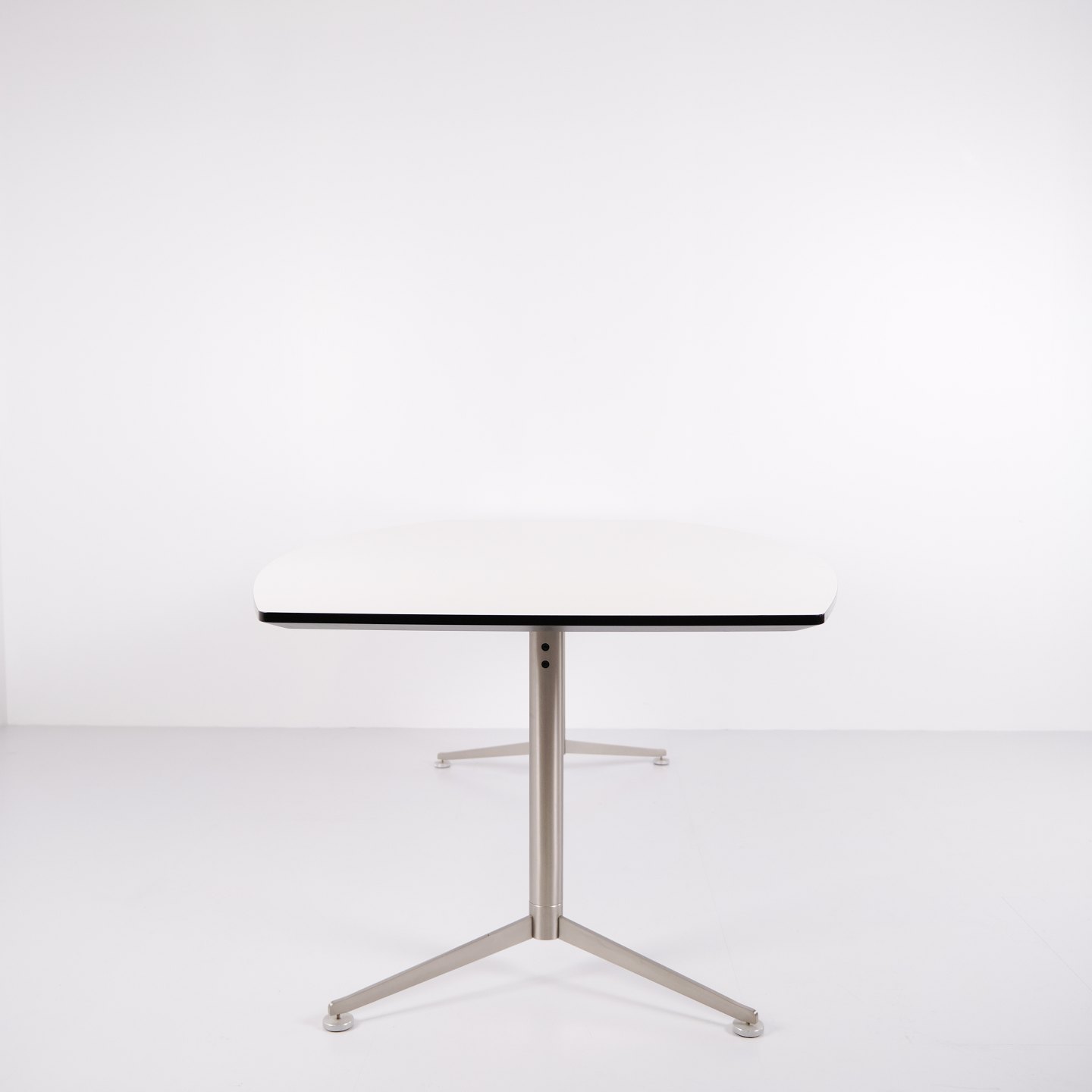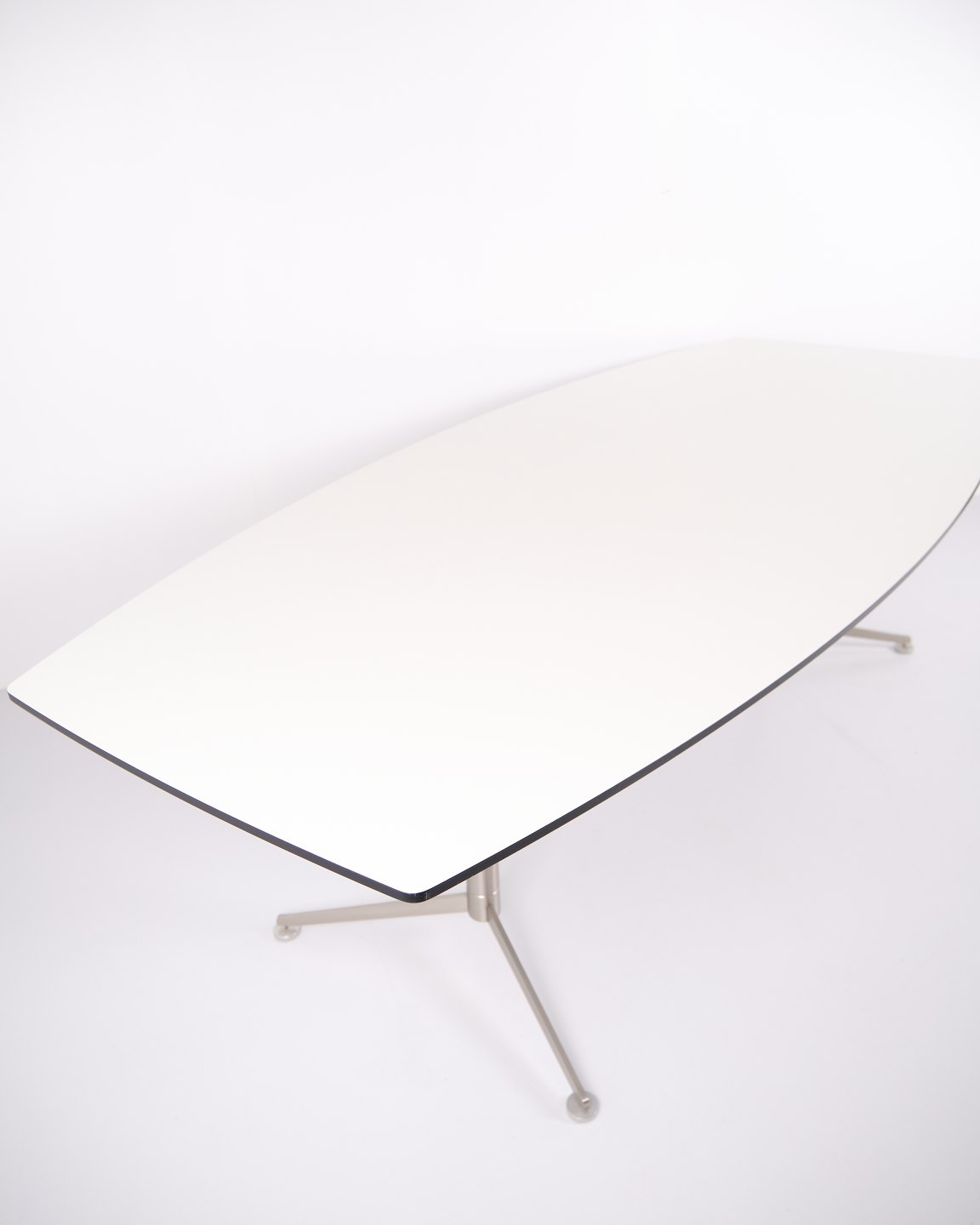 Paustian Konferenztisch Modell SP64 Spinal in weißem Laminat mit Gestell aus gebürstetem Stahl. Dänisches Design mit funktionalem und modernem Ausdruck.— Herkunft: Dänemark