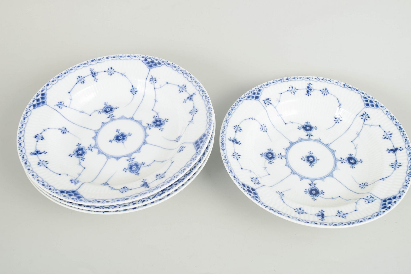 Royal Copenhagen Musselmalet Halvblonde sæt af fire dybe tallerkener.Sæt af fire dybe tallerkener i håndmalet porcelæn fra Musselmalet Halvblonde med klassisk underglasurdekoration i koboltblå og karakteristisk blondekant. Model 1/565. Første sortering.