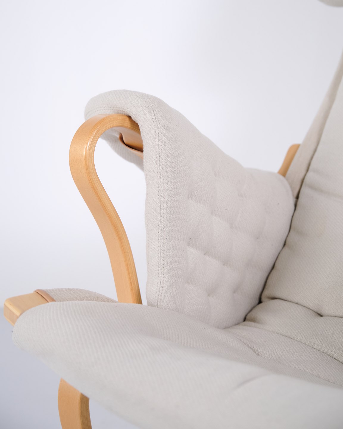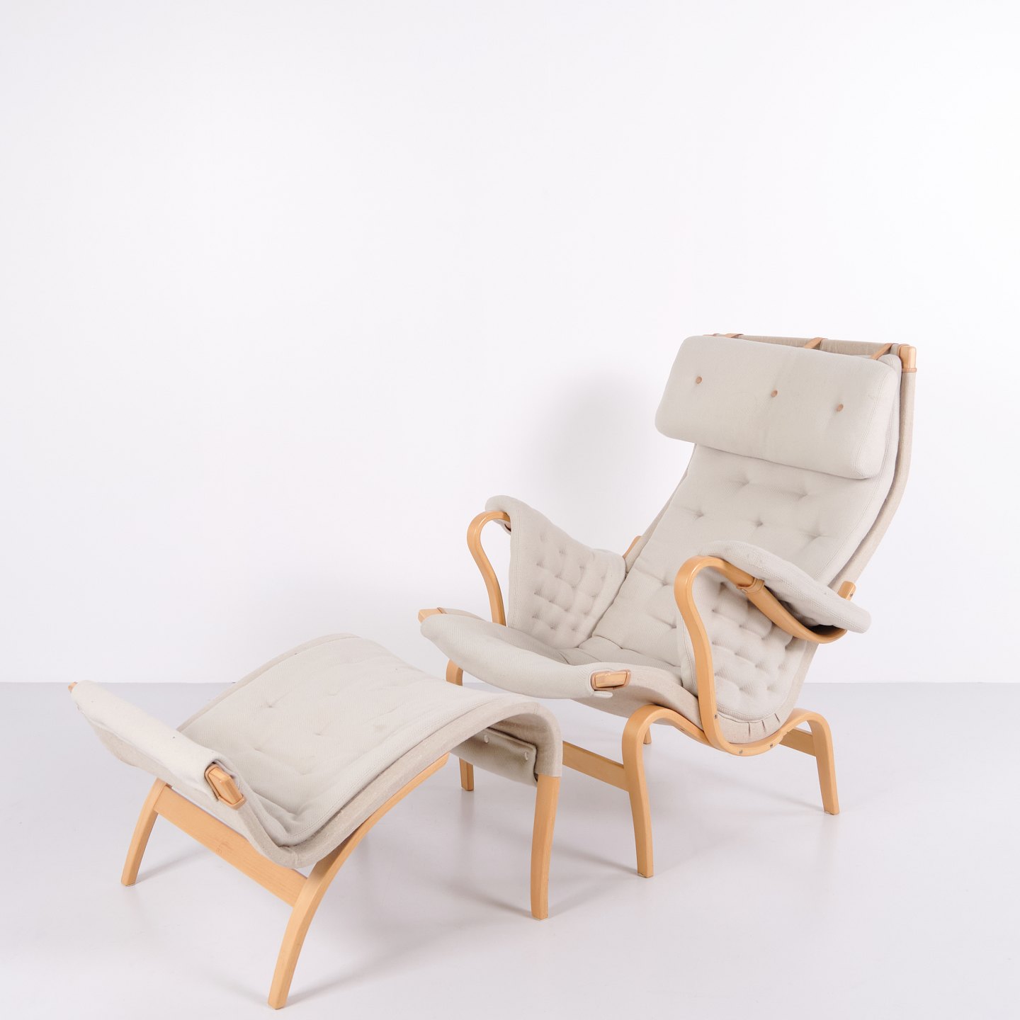 Pernilla Sessel mit passendem Hocker, Modell 69, entworfen von Bruno Mathsson und hergestellt von DUX als 35-Jahre Jubiläumsausgabe. Der Sessel ist aus Buchenholz gefertigt und mit hellem Stoff gepolstert und verfügt über ein charakteristisches, ergonomisches Design, das den natürlichen Kurven des Körpers folgt und hohen Komfort bietet.— Herkunft: Schweden