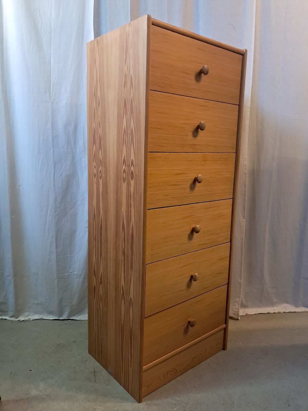 Kommode i fineret fyrretræ, fra 1980erne.Den har brugsspor.