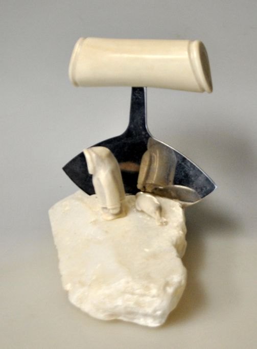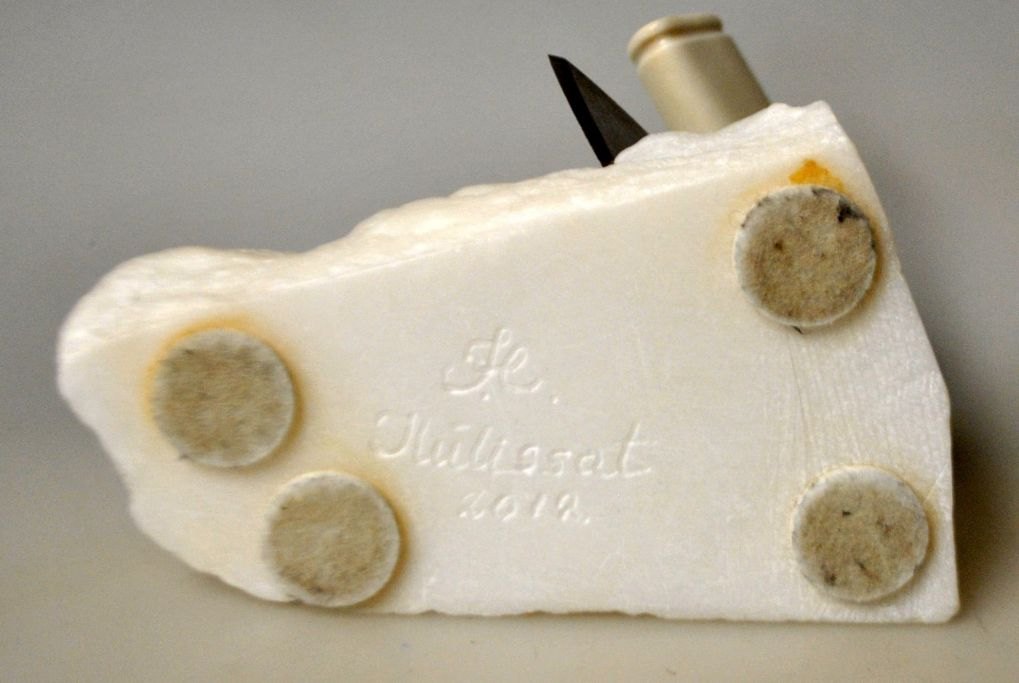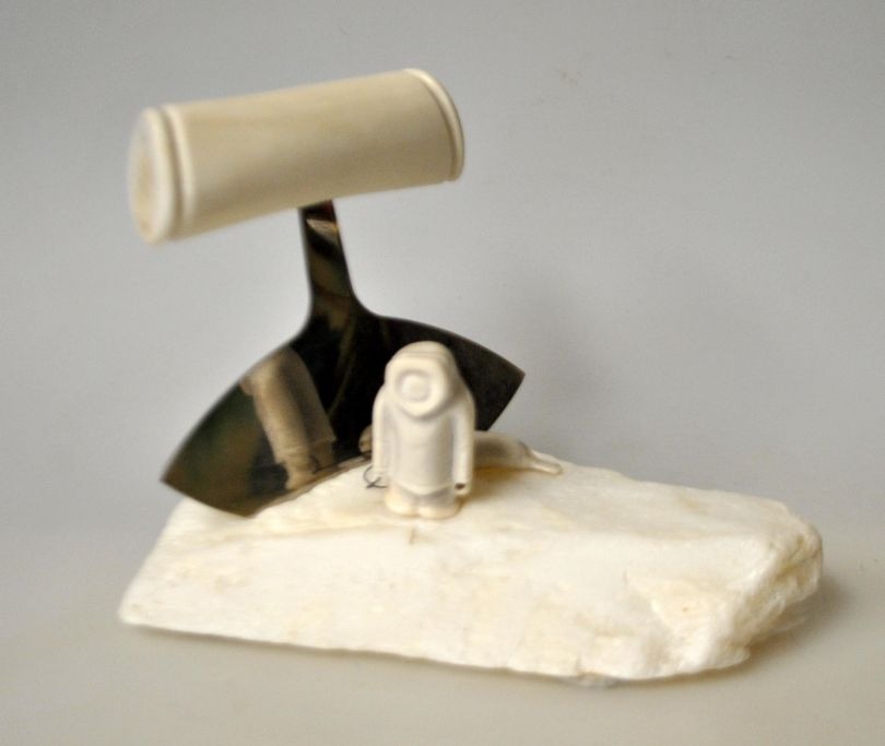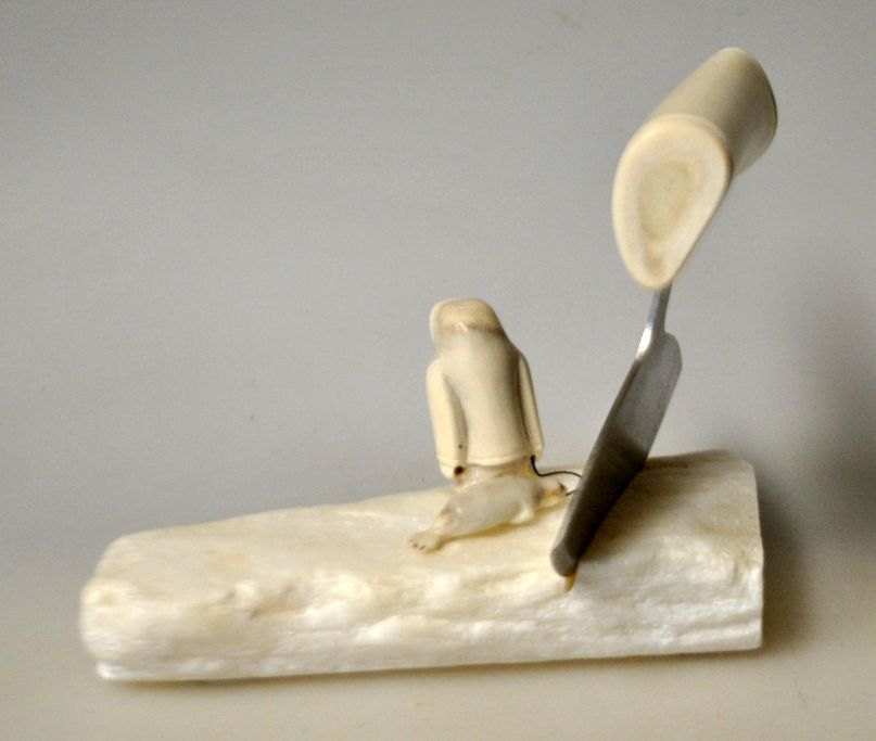 Grönländische Figur, 2012. Figur und Ulu aus Rentierknochen. Auf weißem Specksteinsockel. Signiert: Ilulissat. L.: 14 cm. B.: 8 cm. H.: 10 cm.Bestellnummer: 28967