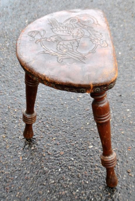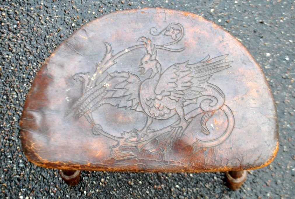 Dreibeiniger Holzhocker mit Ledersitz, 19. Jahrhundert. Geschnitztes Leder mit Hahnenmotiv. Nieten in Stern- und Blumenform. Höhe: 39 cm. Breite: 40 cm. Tiefe: 33 cm.Bestellnummer: 29030
