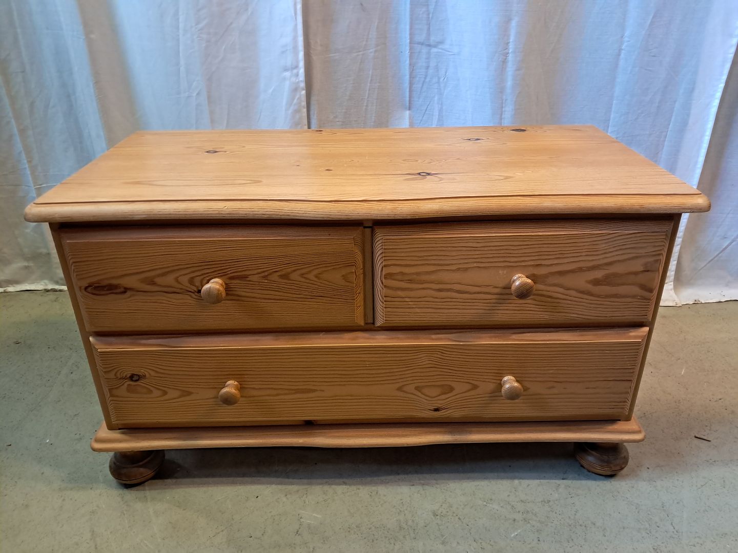 Kommode i massivt fyrretræ, fra 1980erne.Den har brugsspor.
