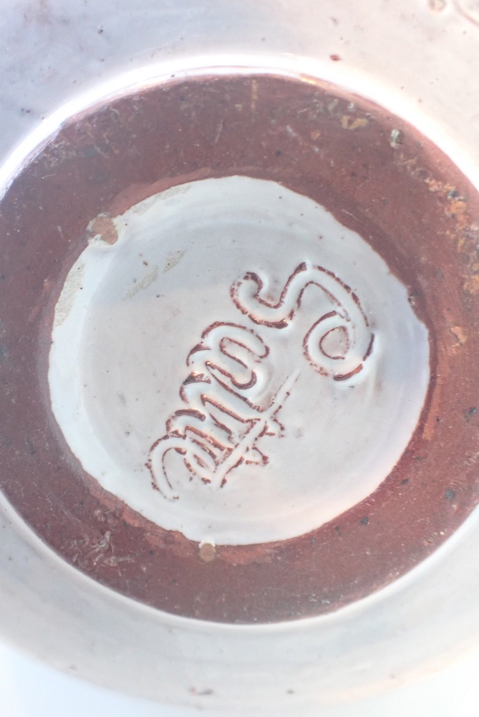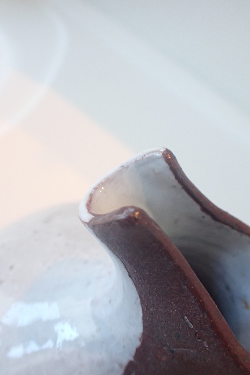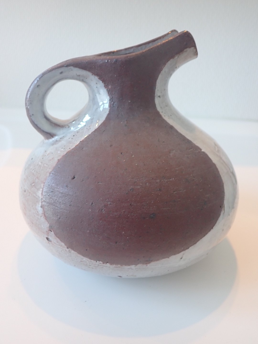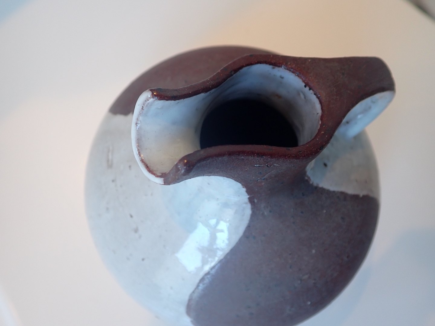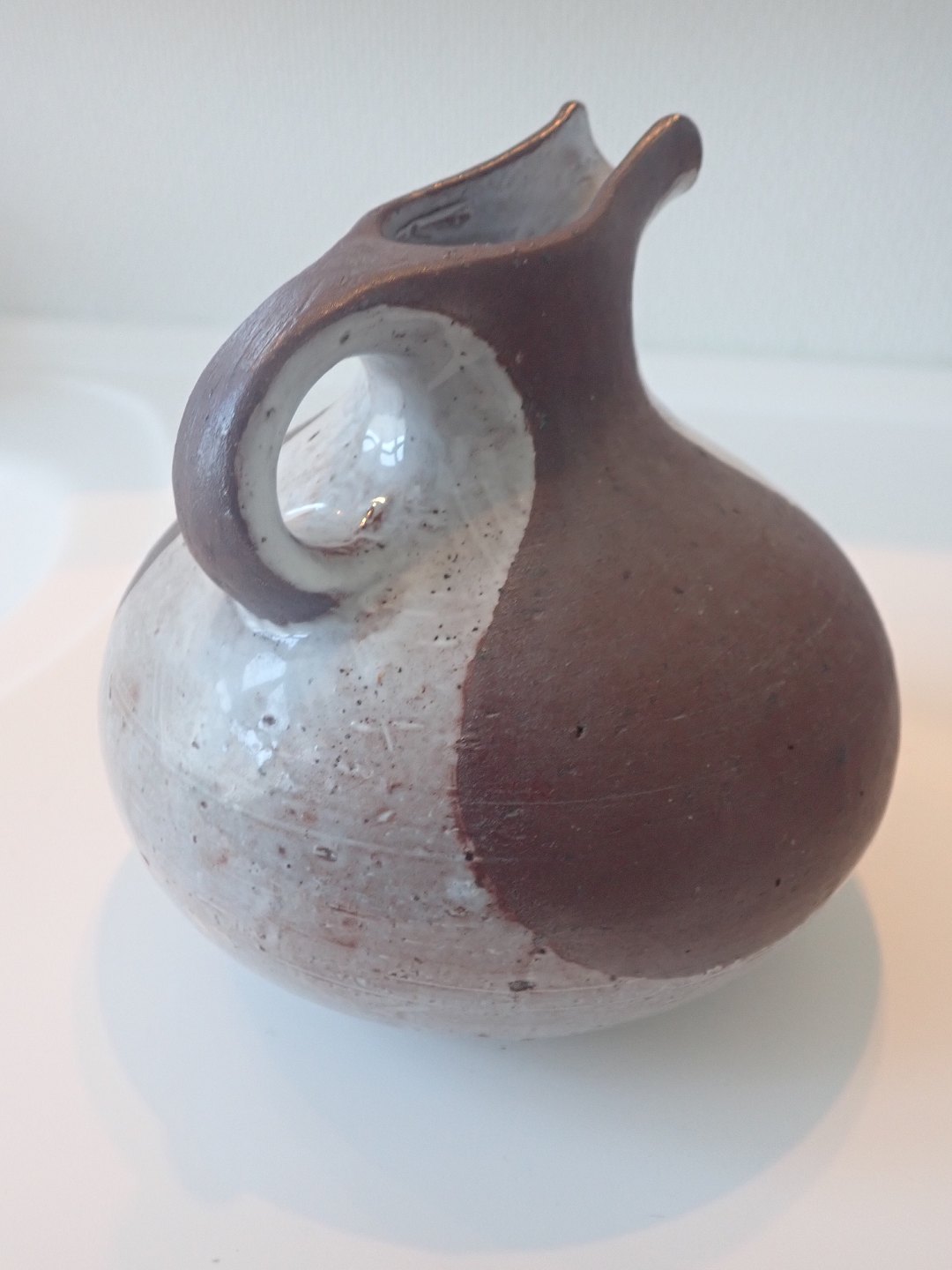 Gutte Eriksen (1918 - 2008) - spaltekande i hårdtbrændt ler med delvis, skulpturel glasering i lysegrå nuance. Ca. 1950. Højde: 14 cm. Bredeste bredde: 13,5 cm. I fin stand. Händler