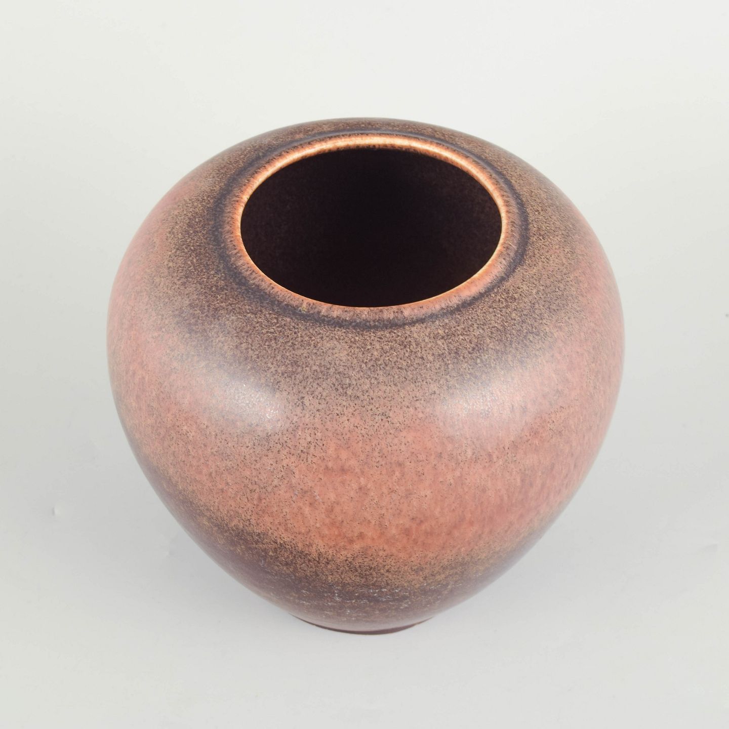 Saxbo, stor vase.Stor, rundbuet vase i stentøj med bred åbning og fyldig korpus. Glasuren er i varme rosa og brunlige nuancer med blød overgang og dyb, levende overfladekarakter, typisk for Saxbos eksperimenterende glasurarbejde.