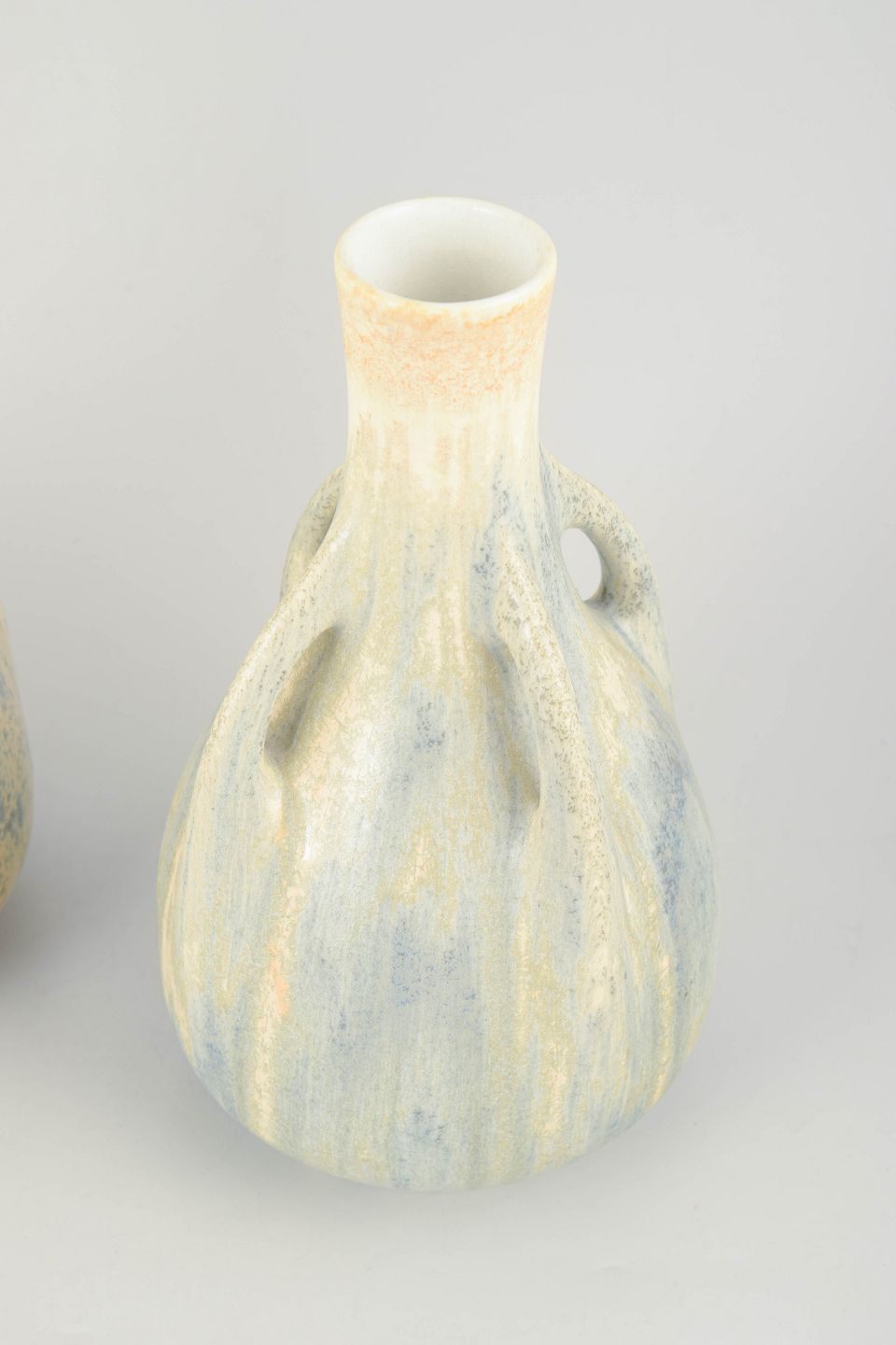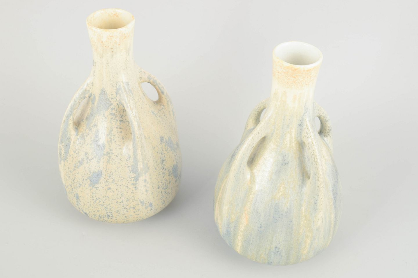 Rörstrand, par art nouveau fajancevaser.To elegante fajancevaser med balusterform og integrerede hanke ved halsen. Glasuren fremstår i bløde, nuancerede toner af elfenben, lyseblå og sandfarve med let løbende effekt, karakteristisk for tidlig 1900-tals svensk fajance.