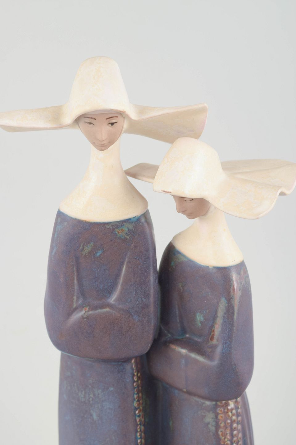 Lladró stor figurgruppe i porcelæn.Monumental keramisk figurgruppe fra 1980’erne, fremstillet i porcelæn med karakteristisk blød modellering og afdæmpet glasur i violette og cremefarvede toner. Figuren forestiller to stiliserede kvindeskikkelser med brede hatte og elegante, vertikale kjolelinjer. Undersiden mærket Lladró, Hand Made in Spain, Daisa.