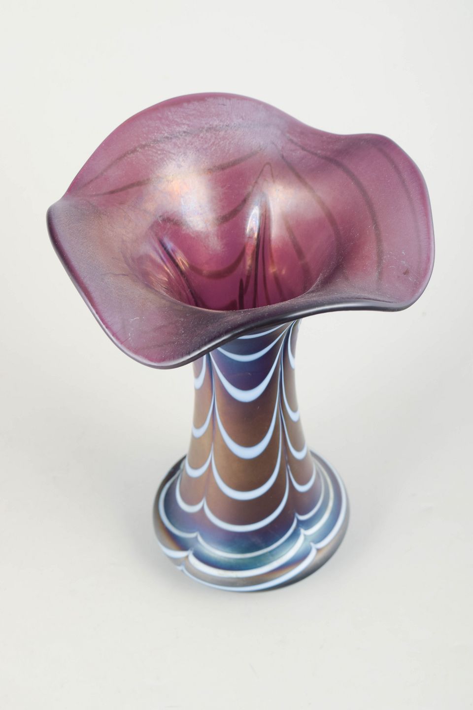 Loetz iriserende glasvase.Større vase i mundblæst glas med rundet korpus og bred, let udadbøjet rand. Overfladen fremstår med silkemat iriserende finish i gyldne, blålige og let violette nuancer, som skifter afhængigt af lyset. Den harmoniske, balancerede form kombineret med det metalliske farvespil er karakteristisk for Loetz’ produktion i 1920’erne, hvor enkle klassiske former blev forenet med raffinerede overfladeeffekter.