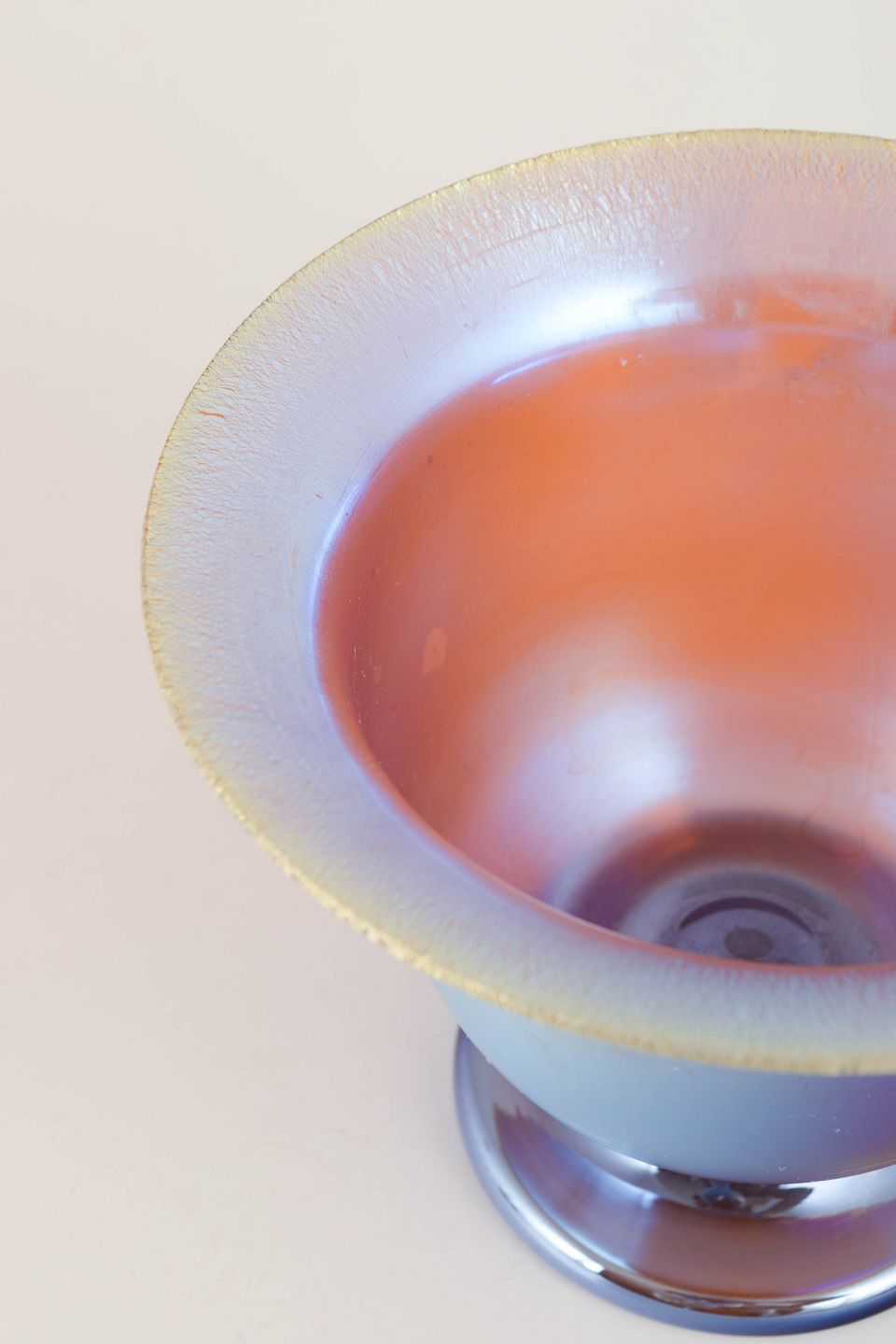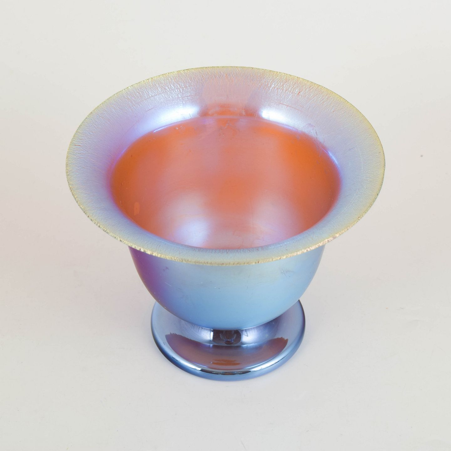 Loetz iriserende glasvase.Skålformet vase i mundblæst glas med bred, let udadbøjet rand og kort standfod. Overfladen har en silkemat iriserende finish i blå og violette nuancer med varmt kobberfarvet skær indvendigt. Den enkle, klassiske form kombineret med det levende farvespil er karakteristisk for Loetz’ produktion i 1920’erne, hvor harmoniske proportioner og metallisk glans var centrale æstetiske virkemidler.