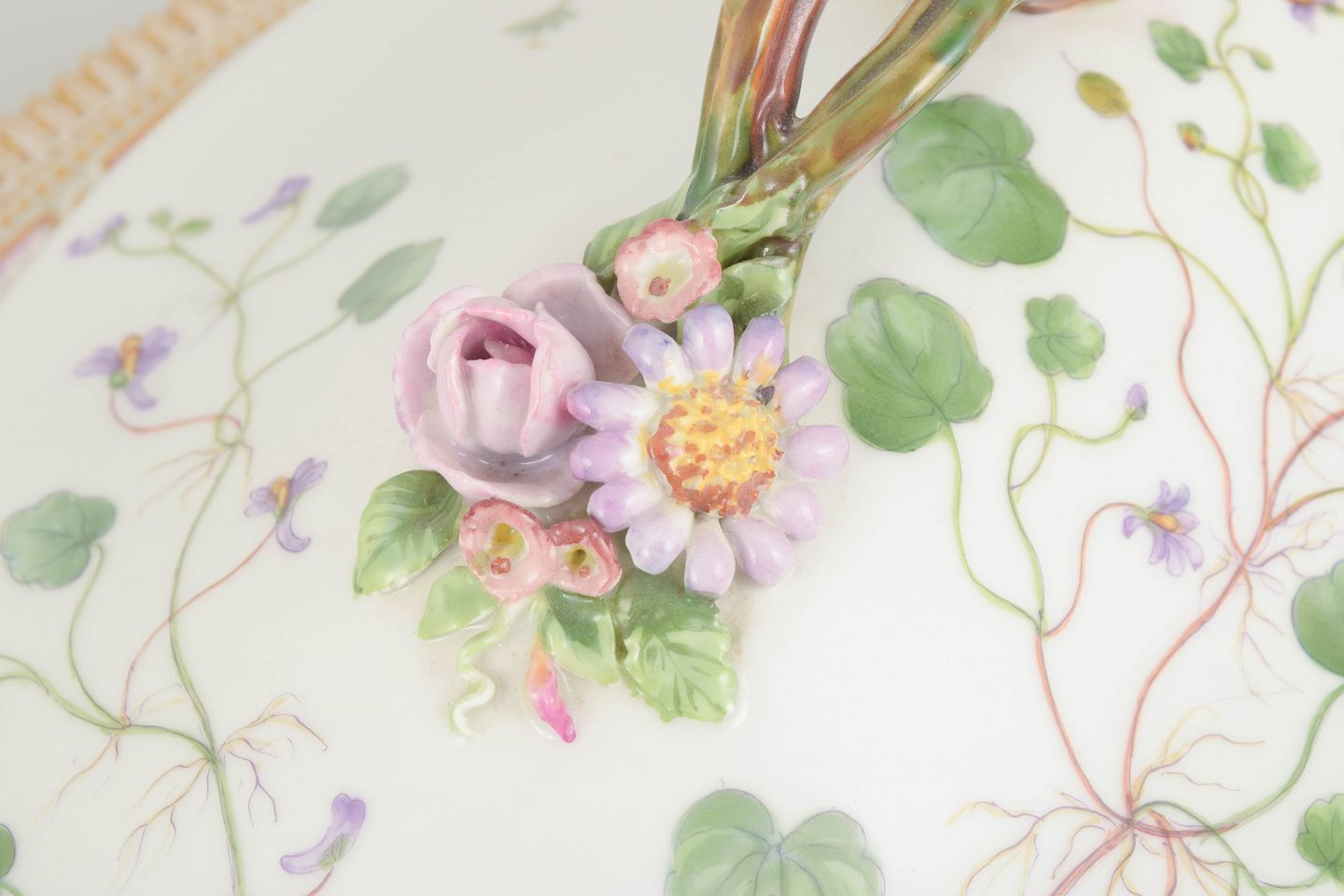 Royal Copenhagen Flora Danica lågfad.Imponerende og monumentalt udført lågfad i håndmalet porcelæn fra Flora Danica-serien, dekoreret med botanisk motivet Linaria Cymbalaria Mill., sirligt gengivet med videnskabelig præcision og forfinet penselføring. Låget er rigt udsmykket med naturalistiske blomster og slyngende ranker, afsluttet med relief modelleret knop med blomsterdekoration. Foden og randen er dekoreret med forgyldte detaljer og klassisk kantornamentik. Model 20/3567.