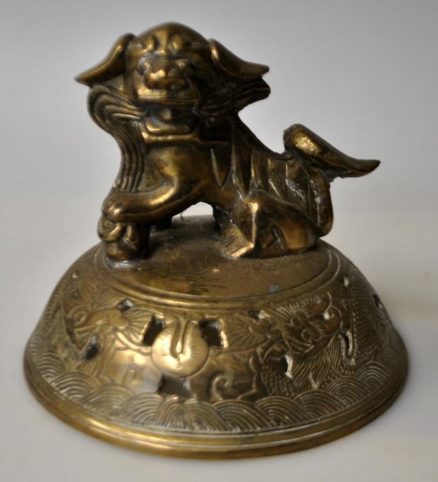 Dreibeiniger chinesischer Räuchergefäß aus Bronze, 19. Jahrhundert. Mit zwei Henkeln; durchbrochener Deckel mit Löwenmotiv. Der Korpus ist mit einem Drachen und Blumen verziert. Höhe: 32 cm, Breite: 25 cm. Gestempelt.Bestellnummer: 29042