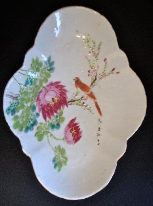 Chinesische Porzellanschale, 19. Jahrhundert. Handbemalt mit Blumen und Vögeln. Achteckig. Länge: 27,5 cm. Breite: 20 cm.Einwandfreier Zustand!