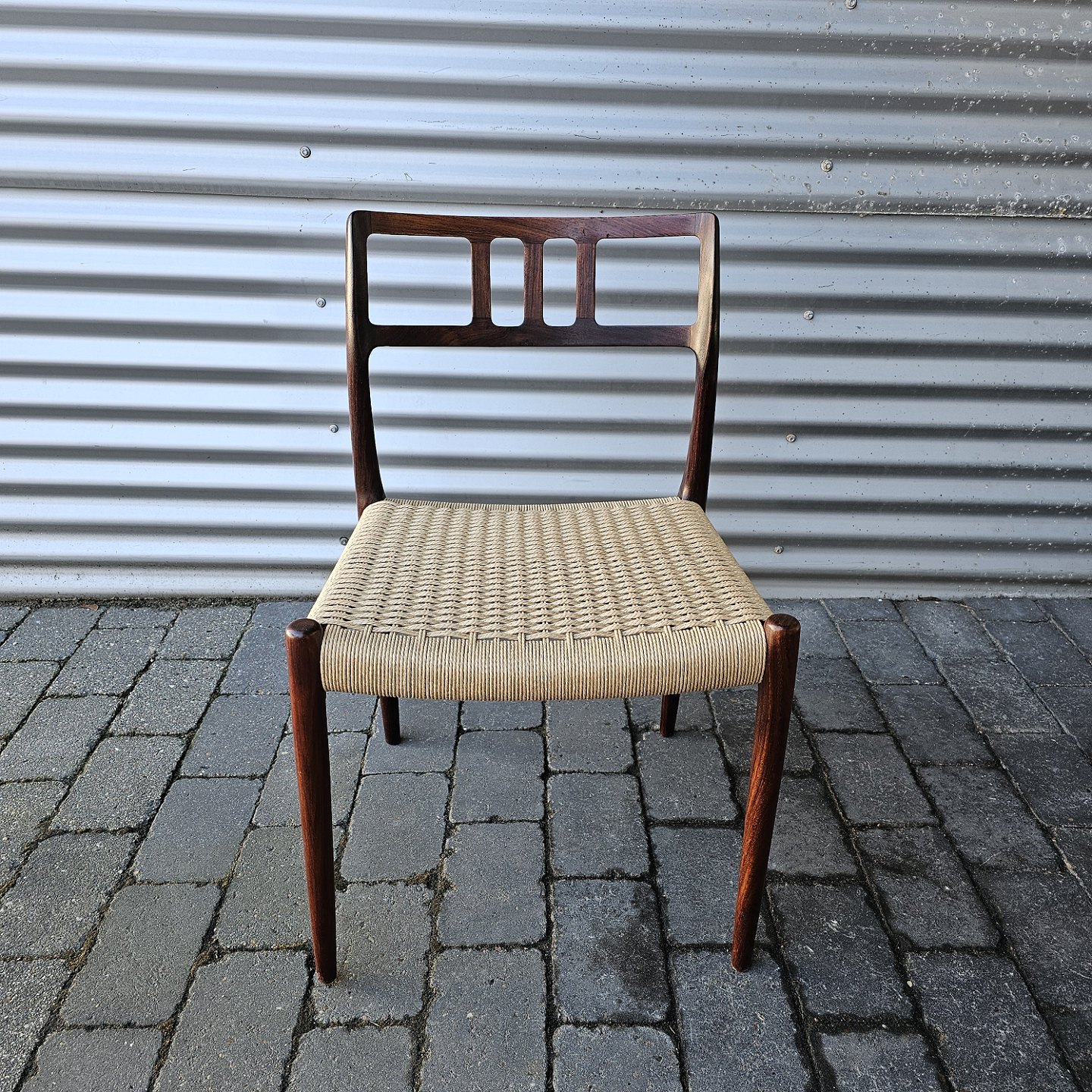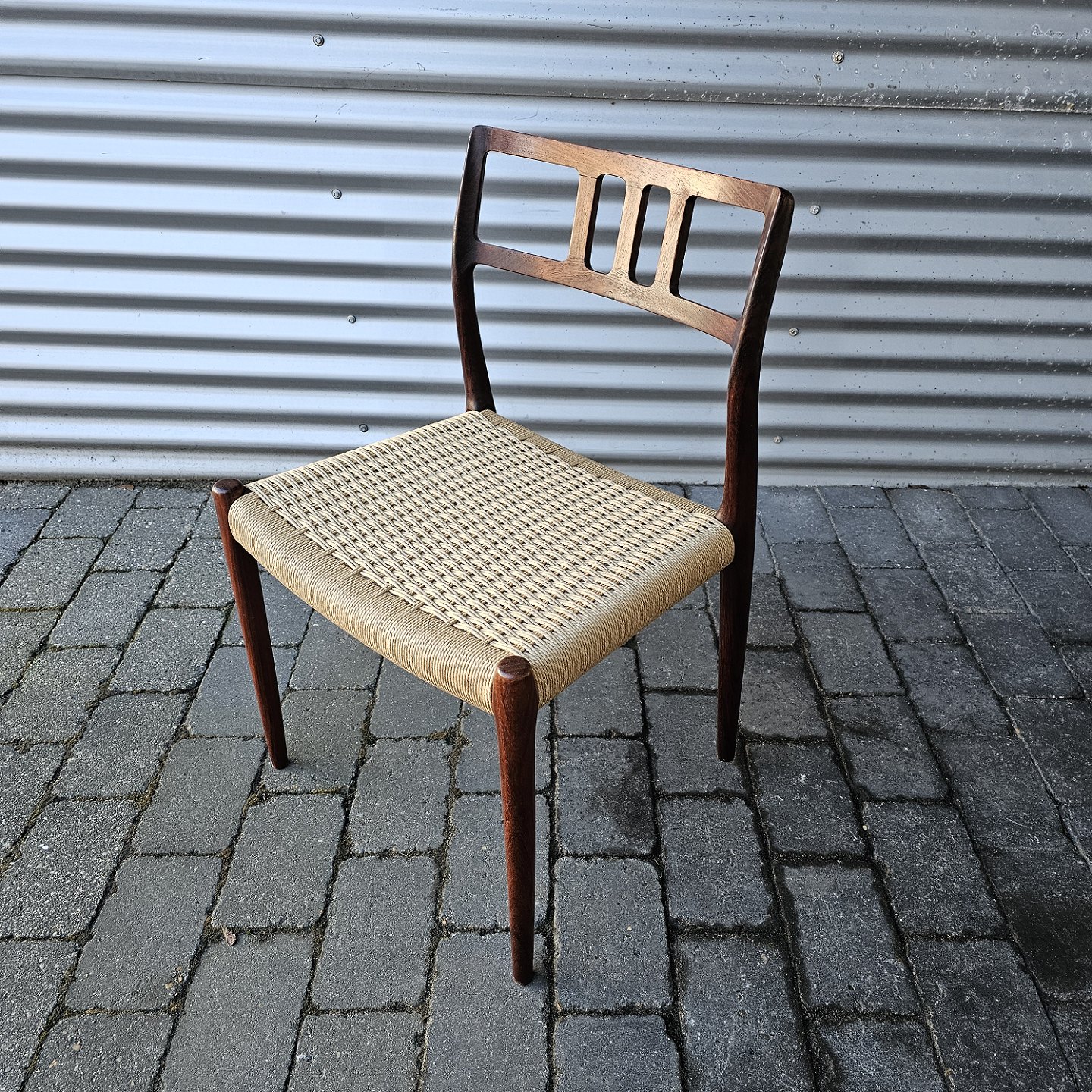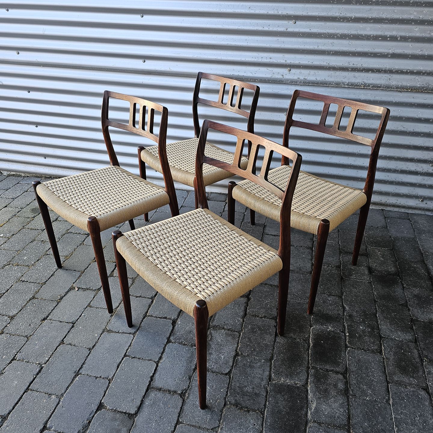 Sæt med fire styk spisebordsstole model 79 i palisander med ny flettede sæderDesign Niels Ole Møller