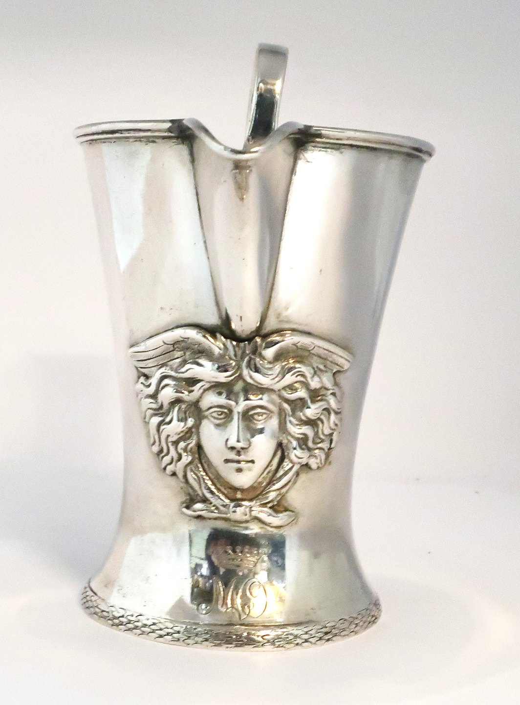 Gebr. Godet & Co., Berlin. Silberkrug mit Medusenbildnis (800). Höhe 15 cm. Mit gravierter Grafenkrone. Händler