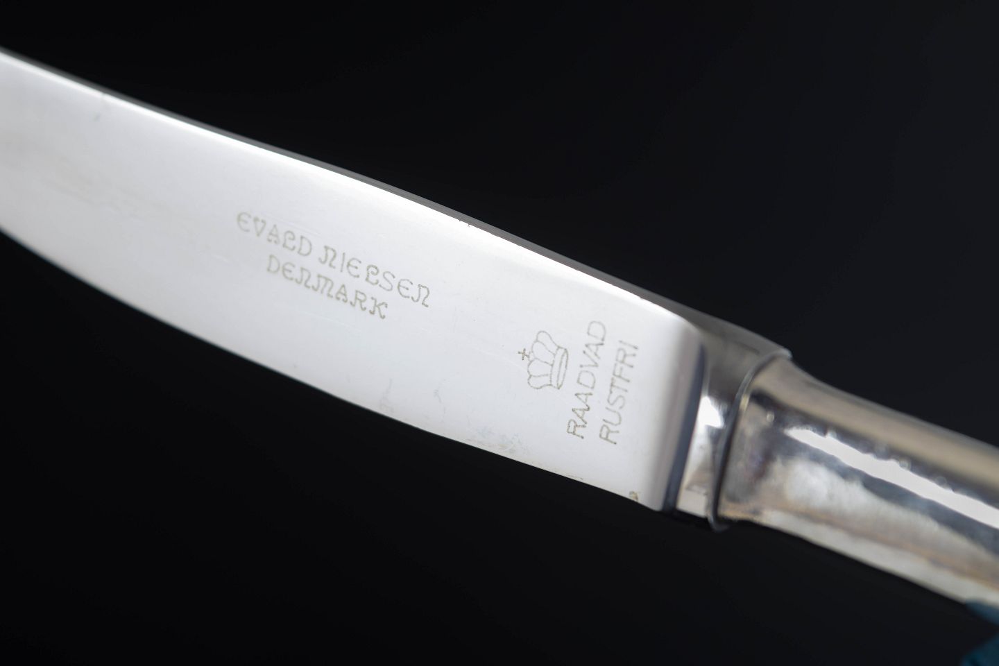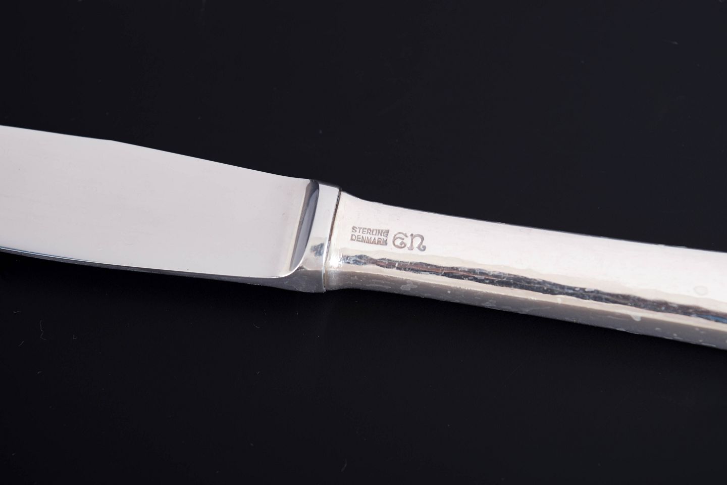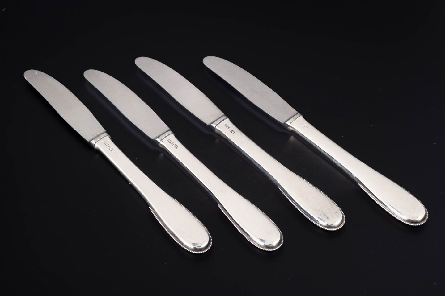 Evald Nielsen, fire frokostknive. Model nummer 14.Elegante frokostknive i sterlingsølv og rustfrit stål. Model nummer 14 med klassisk, let afrundet skaftform med diskret perlekant og glat klinge. Fremstillet hos Evald Nielsen.