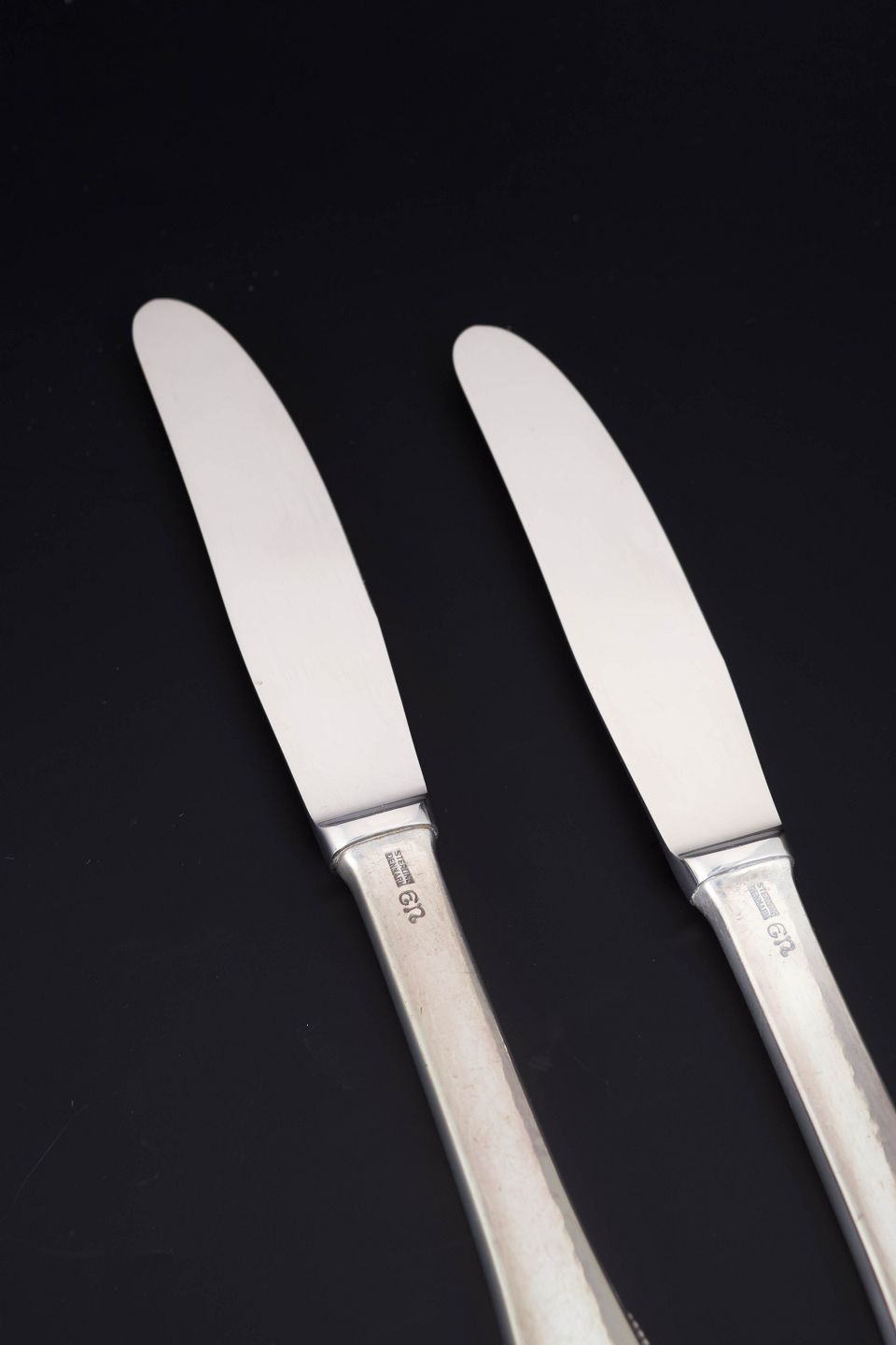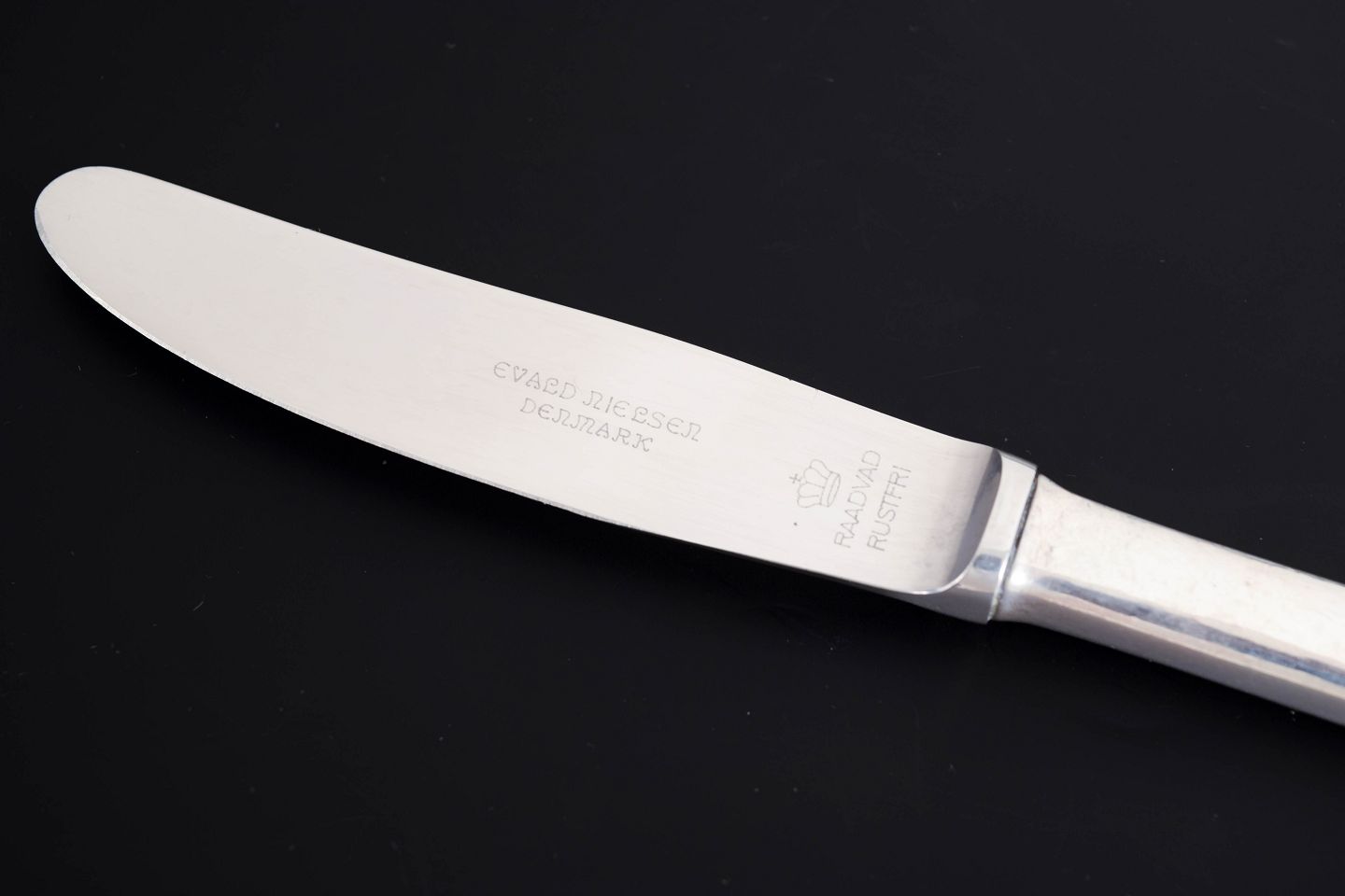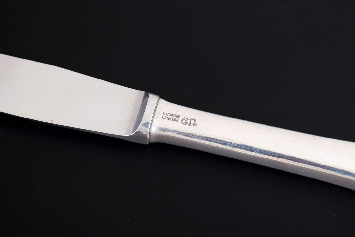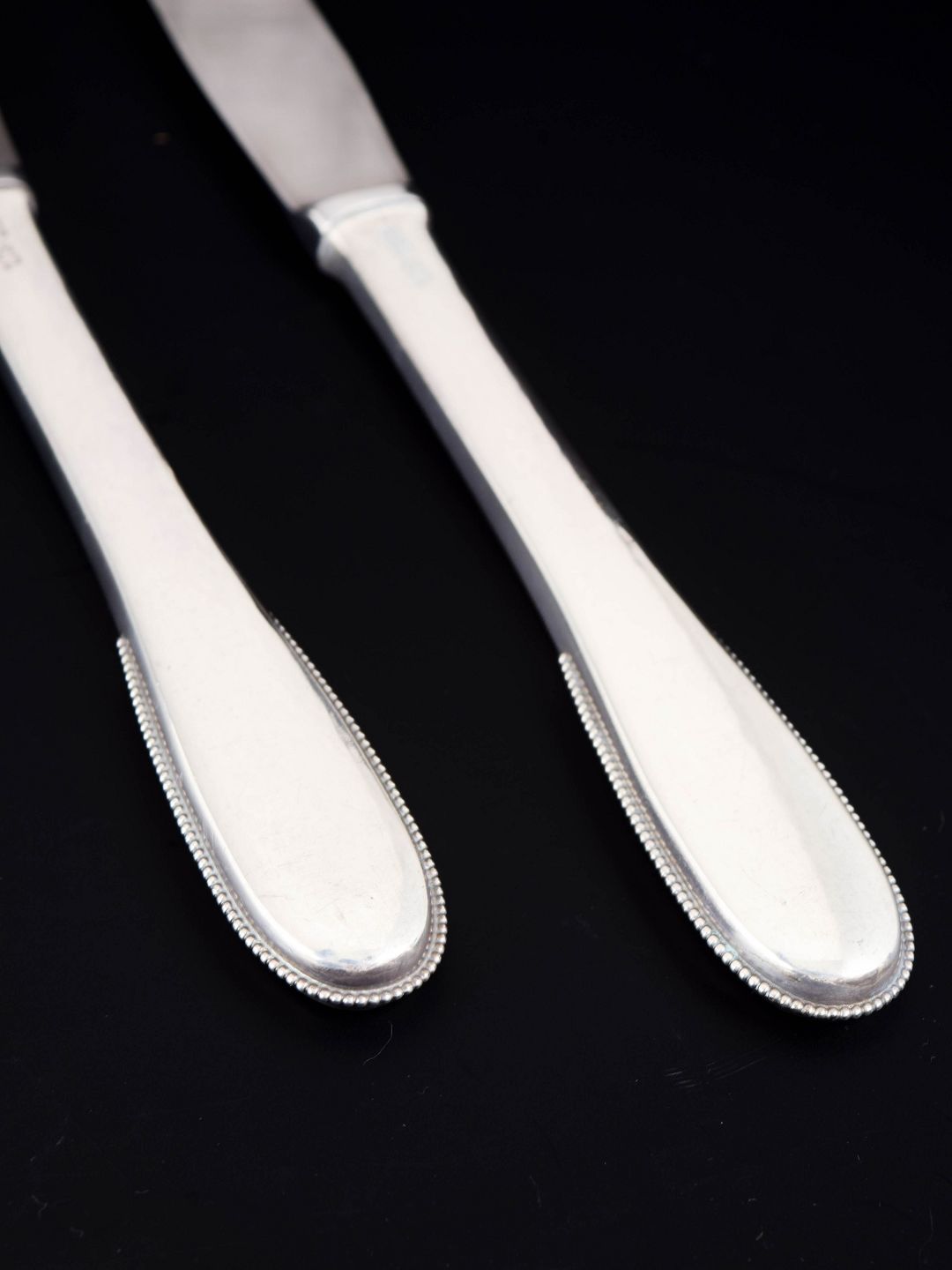 Evald Nielsen, to frokostknive. Model nummer 14.Elegante frokostknive i sterlingsølv og rustfrit stål. Model nummer 14 med klassisk, let afrundet skaftform med diskret perlekant og glat klinge. Fremstillet hos Evald Nielsen.