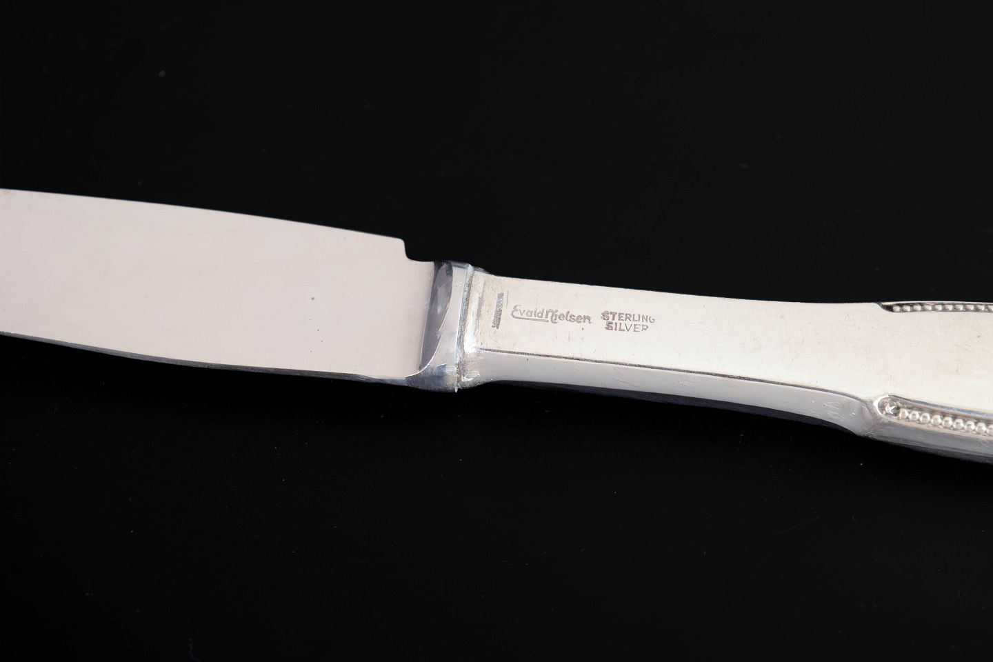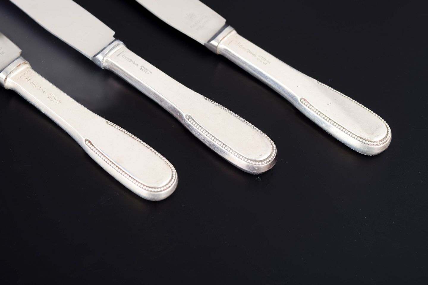 Evald Nielsen, tre frokostknive. Model nummer 14.Elegante frokostknive i sterlingsølv og rustfrit stål. Model nummer 14 med klassisk, let afrundet skaftform med diskret perlekant og glat klinge. Fremstillet hos Evald Nielsen.