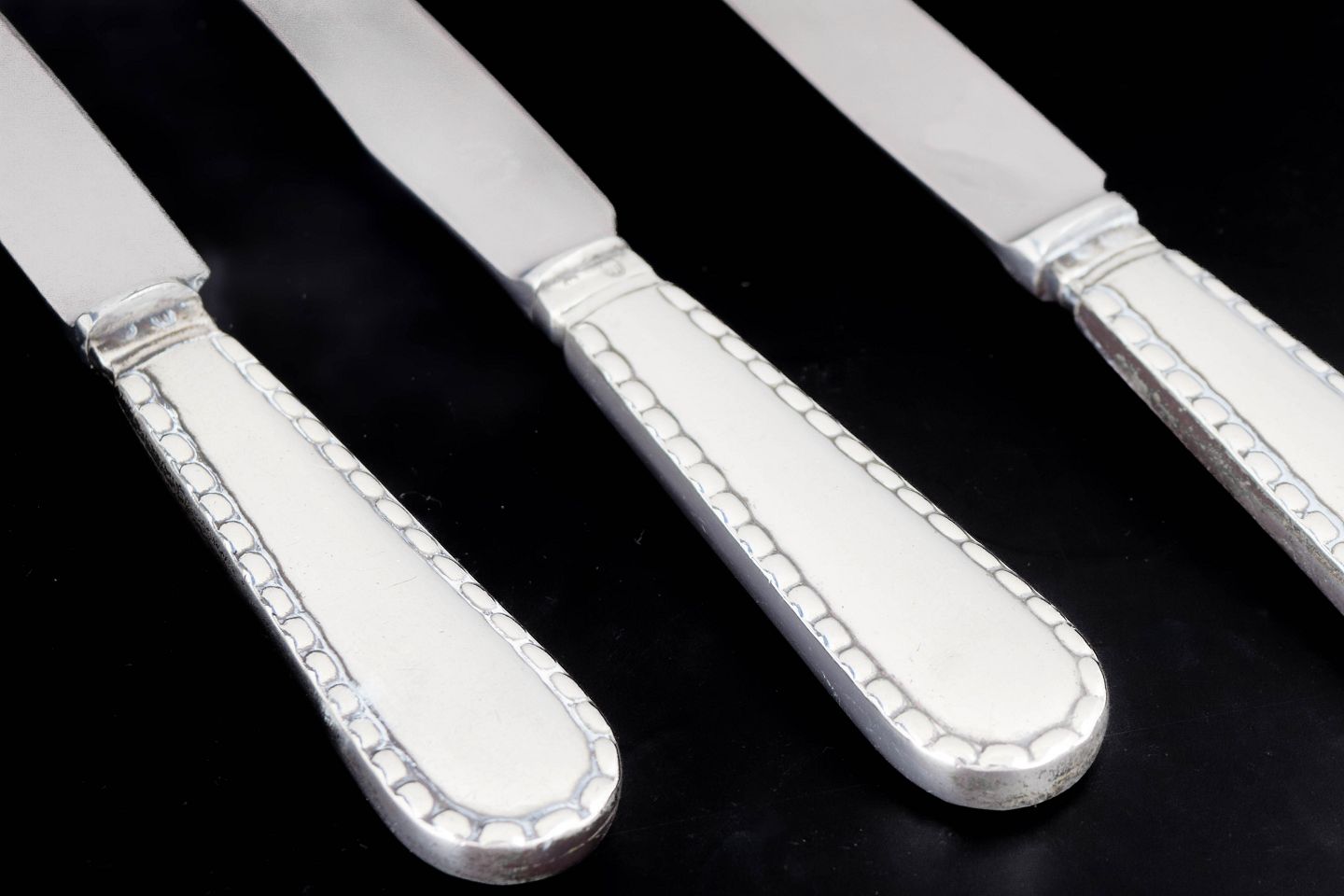 Georg Jensen, sæt af tre knive Perle.Sæt af tre knive i rustfrit stål og tretårnet sølv i mønstret Perle fra Georg Jensen. Skaftet er udformet med en karakteristisk perlerand langs kanten, et klassisk dekorativt motiv som giver bestikket et elegant og tidløst udtryk.
