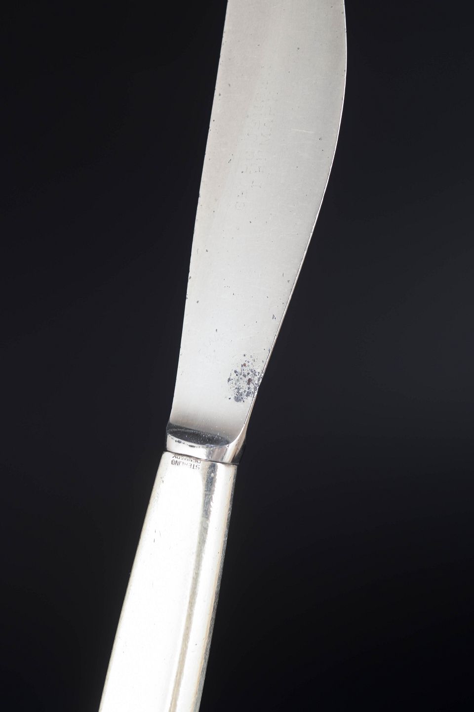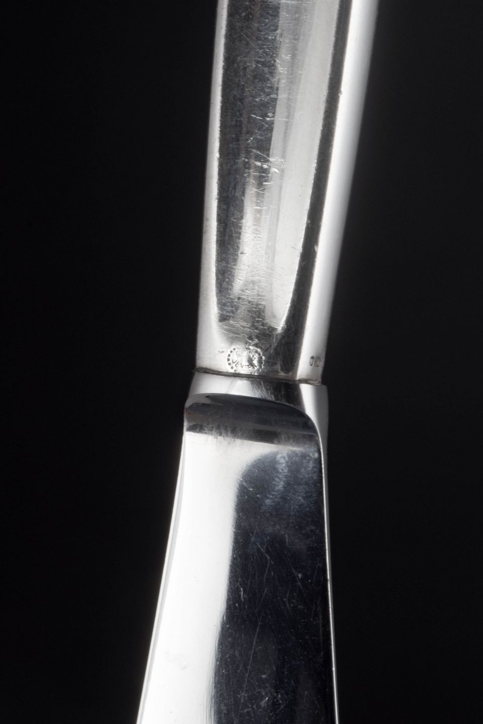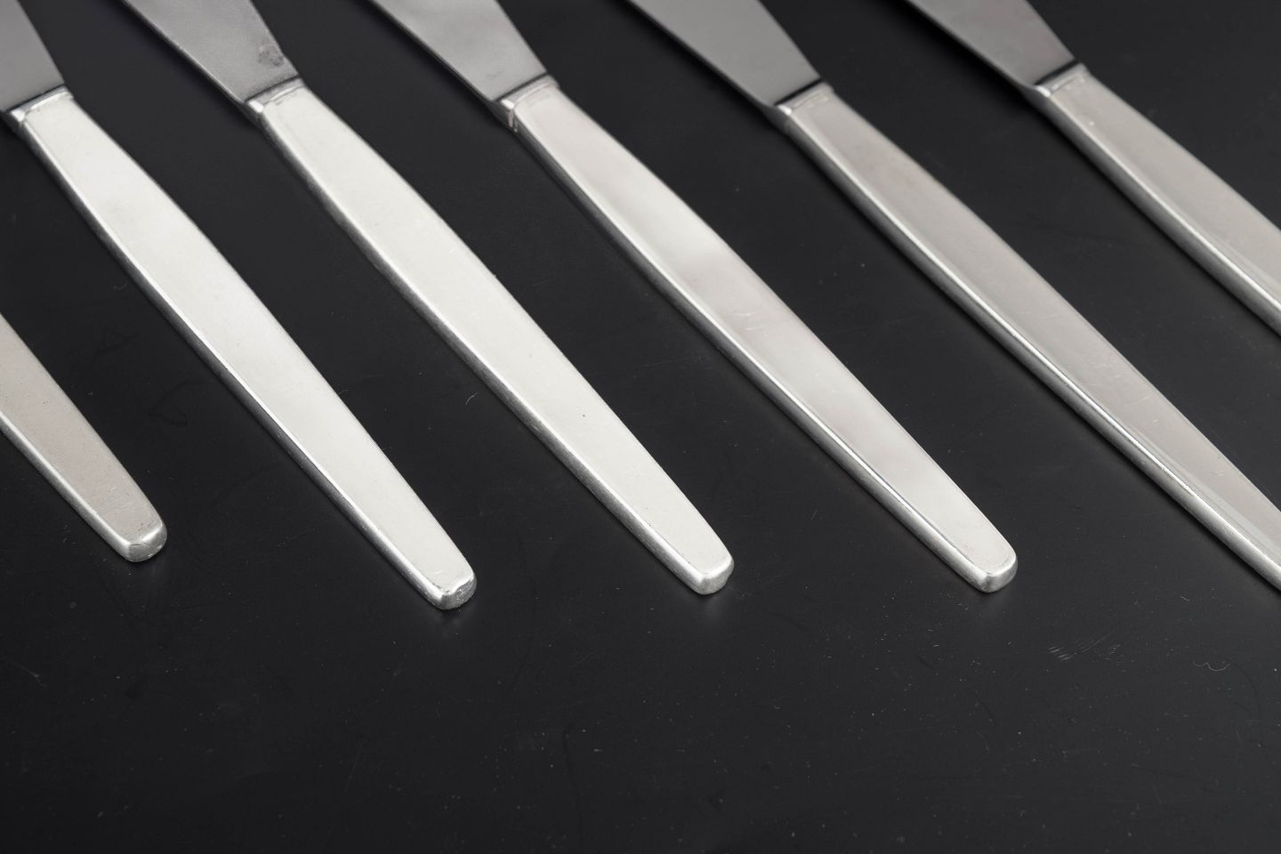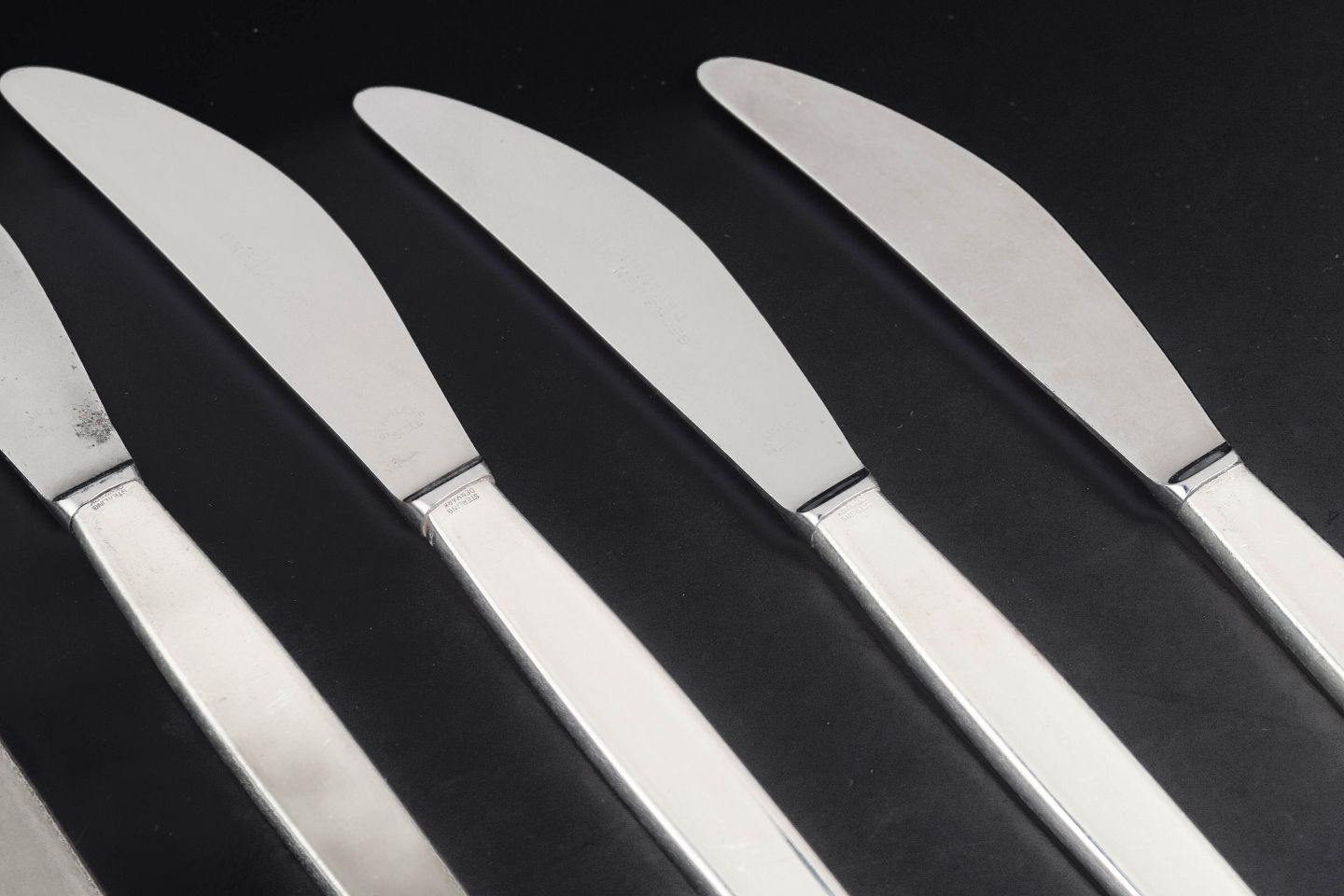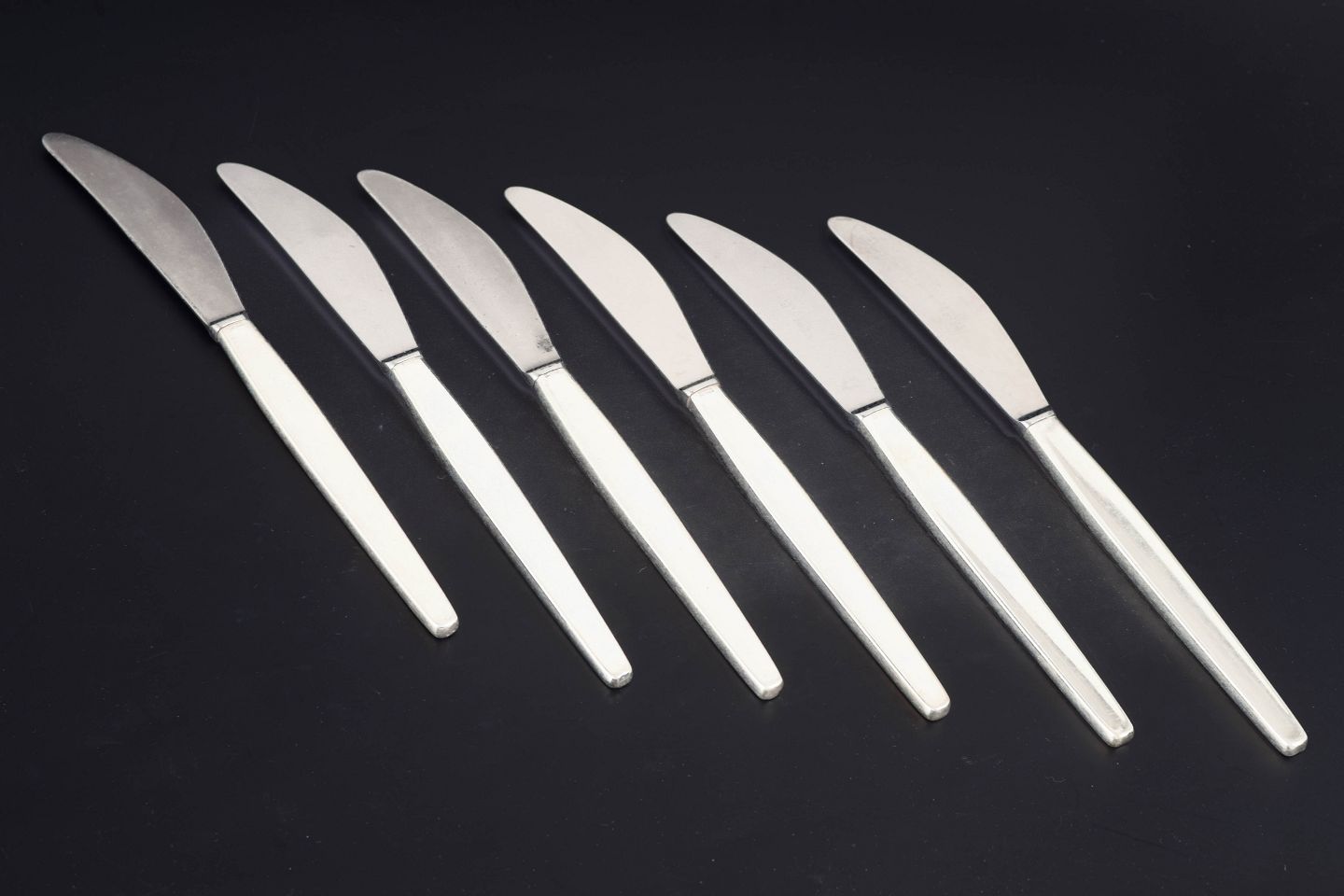 Georg Jensen, sæt af seks frokostknive, Cypress.Sæt af seks frokostknive i rustfrit stål og sterlingsølv i modellen Cypress fra Georg Jensen. Bestikket er udført i et slankt og elegant formsprog med let konisk form og glatte, moderne linjer, karakteristisk for Georg Jensens efterkrigsdesign.