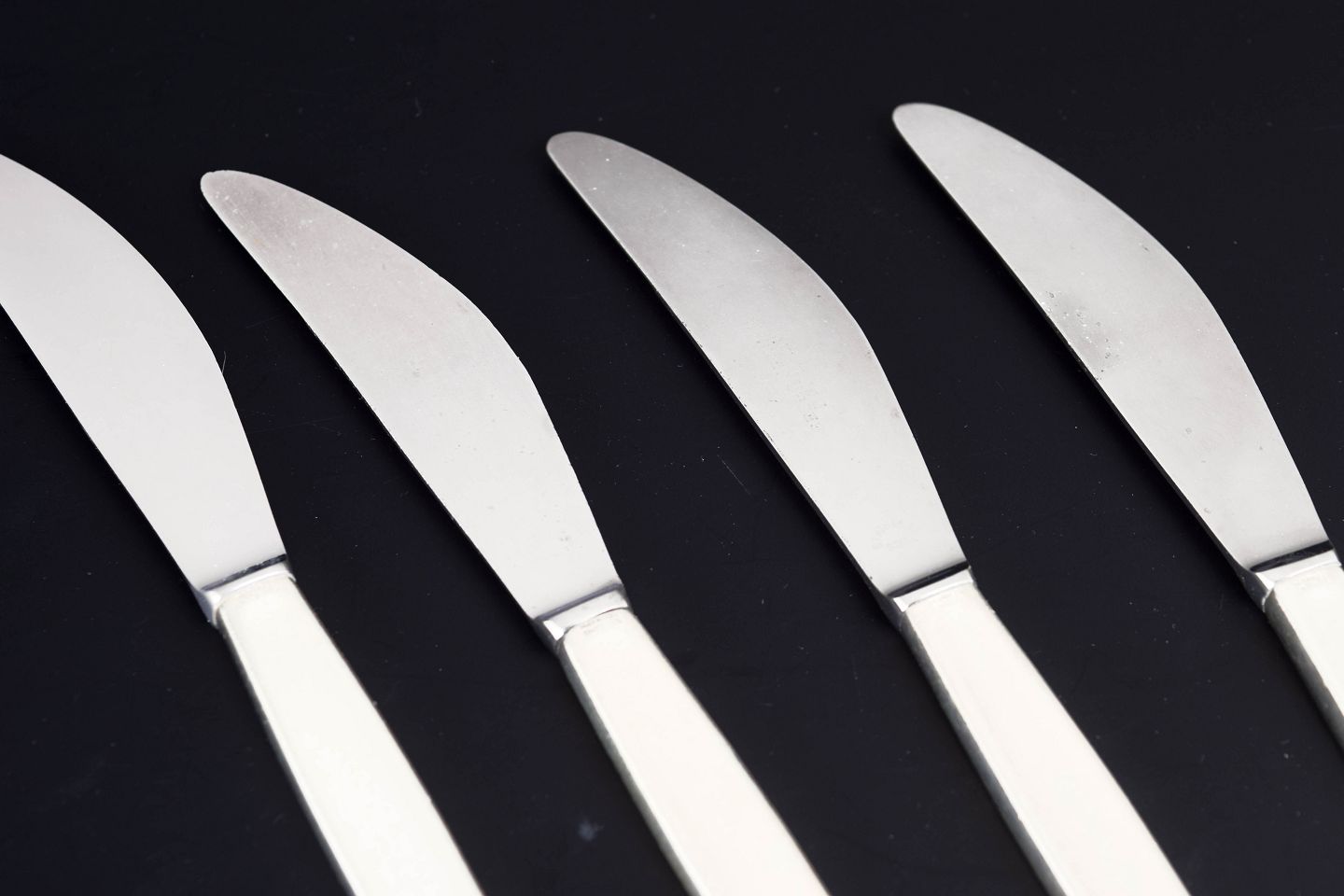 Georg Jensen, sæt af fire frokostknive, Cypres.Sæt af fire frokostknive i rustfrit stål og sterlingsølv i modellen Cypres fra Georg Jensen. Bestikket er udført i et slankt og elegant formsprog med let konisk form og glatte, moderne linjer, karakteristisk for Georg Jensens efterkrigsdesign.
