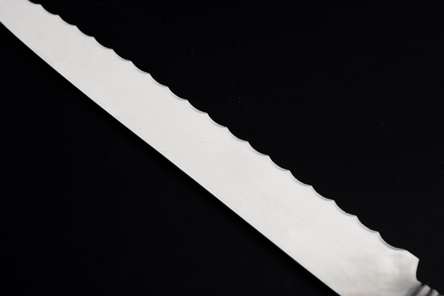 Georg Jensen, brødkniv, Dobbeltriflet.Brødkniv i rustfrit stål og sterlingsølv med skaft i mønstret Dobbeltriflet. Kniven har en lang savtakket klinge i rustfrit stål, velegnet til brød, og et elegant sølvskaft med de karakteristiske dobbelte rifler langs kanten. Et klassisk bestikdesign fra Georg Jensen.
