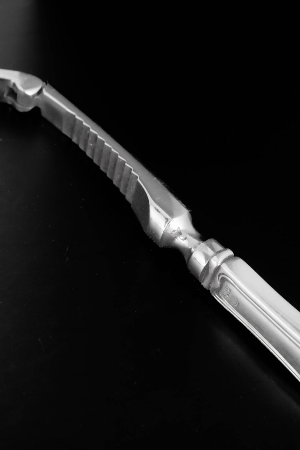 Georg Jensen, nøddeknækker Dobbeltriflet.Elegant nøddeknækker i rustfrit stål og sterlingsølv med skaft i mønstret Dobbeltriflet. Udført med kraftigt tandet greb til at knække nødder og med lange, elegante sølvskaft med de karakteristiske dobbelte rifler langs kanten. Et klassisk bestikdesign fra Georg Jensen.