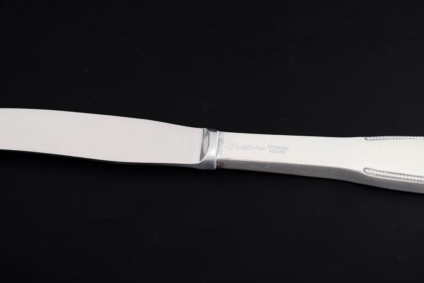 Evald Nielsen frokostknive, sæt af fire.Elegante frokostknive i sterling sølv og rustfrit stål. Model nummer 14 med klassisk, let afrundet skaftform og glat klinge. Fremstillet hos Evald Nielsen, længde 17,7 cm.