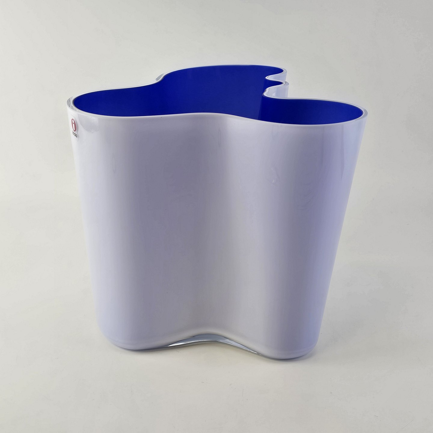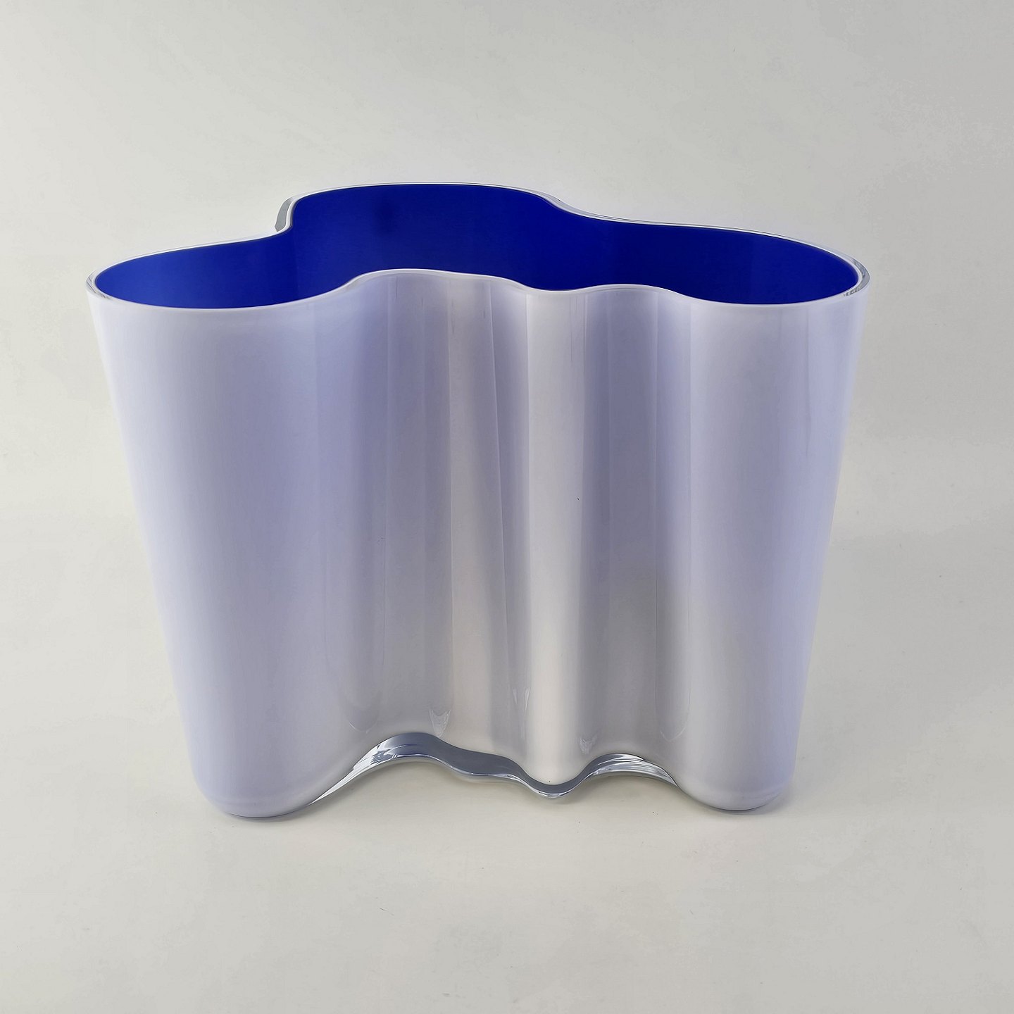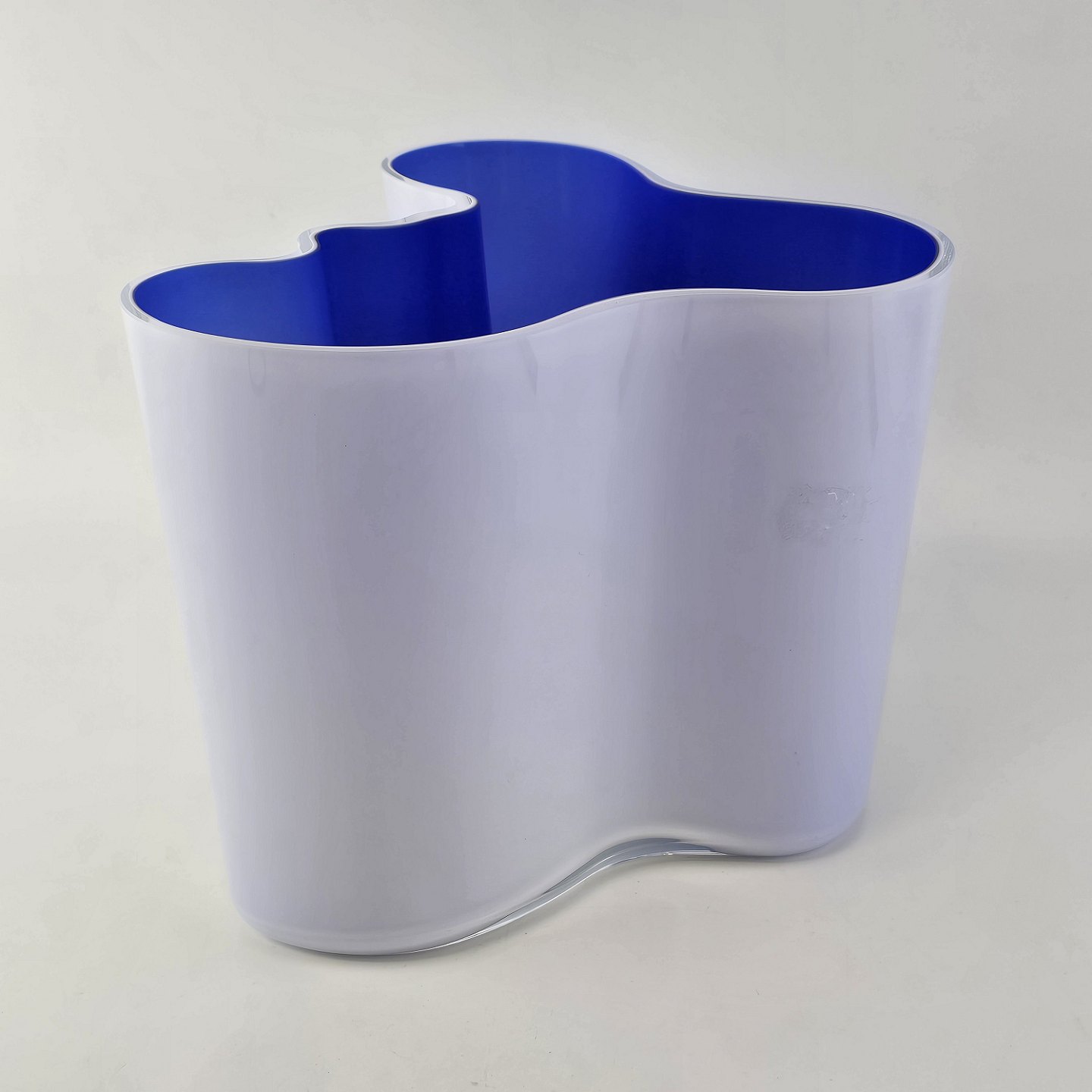 Savoy vase af glas, som er hvid på ydersiden og blå på indersidenFormgiver Alvar Aalto